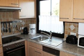 Voll ausgestattete Küche: Kühlschrank mit Gefrierfach, Herd (Ceranfeld), Dunstabzug, Geschirrspüler, Backofen, Wasserkocher, Toaster, Kaffeemaschine, Besteck, Geschirr, Gläser, Töpfe und alle gebräuchlichen Küchenutensilien.