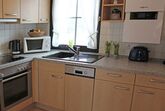 Voll ausgestattete Küche: Kühlschrank mit Gefrierfach, Herd (Ceranfeld), Dunstabzug, Geschirrspüler, Backofen, Wasserkocher, Toaster, Kaffeemaschine, Besteck, Geschirr, Gläser, Töpfe und alle gebräuchlichen Küchenutensilien.