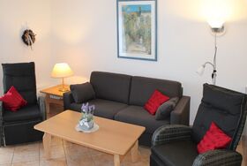 Das freundliche, helle Wohnzimmer lädt ein, sich wohl zu fühlen. Die gemütliche Sitzgruppe mit ausziehbarer Couch bietet Platz für alle Gäste.Ein Flachbild-Fernseher und Radio (Musikanlage) gehören ebenfalls zur Ausstattung dieses Hauses. Vom Wohnzimmer aus gelangen Sie direkt auf Ihre Terrasse. Auf der Terrasse ist das Grillen (mit eigenem Grill) r direkt angrenzende Essbereich bietet Platz für Ihre gemeinsamen Mahlzeiten und gemütliche Abende.