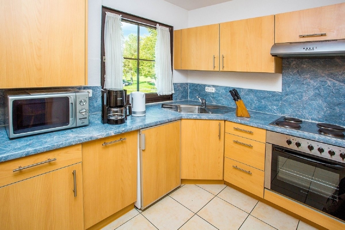 Voll ausgestattete Küche: Kühlschrank mit Gefrierfach, E-Herd, Dunstabzug, Geschirrspüler, Backofen, Wasserkocher, Toaster, Kaffeemaschine, Besteck, Geschirr, Gläser, Töpfe und alle gebräuchlichen Küchenutensilien.
