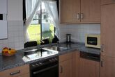 Voll ausgestattete Küche: Kühlschrank mit Gefrierfach, Herd (Ceranfeld), Backofen, Wasserkocher, Toaster, Kaffeemaschine, Besteck, Geschirr, Gläser, Töpfe und alle gebräuchlichen Küchenutensilien.