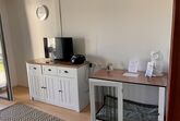 Wohnzimmer mit Couch, Fernseher und Radio/CD, Zugang zur Terrasse