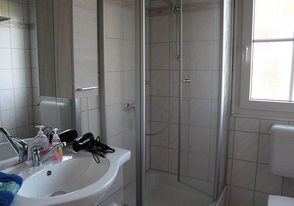 Bad mit Tageslicht Dusche und WC, Handtuchheizkörper, beleuchteter Spiegelschrank