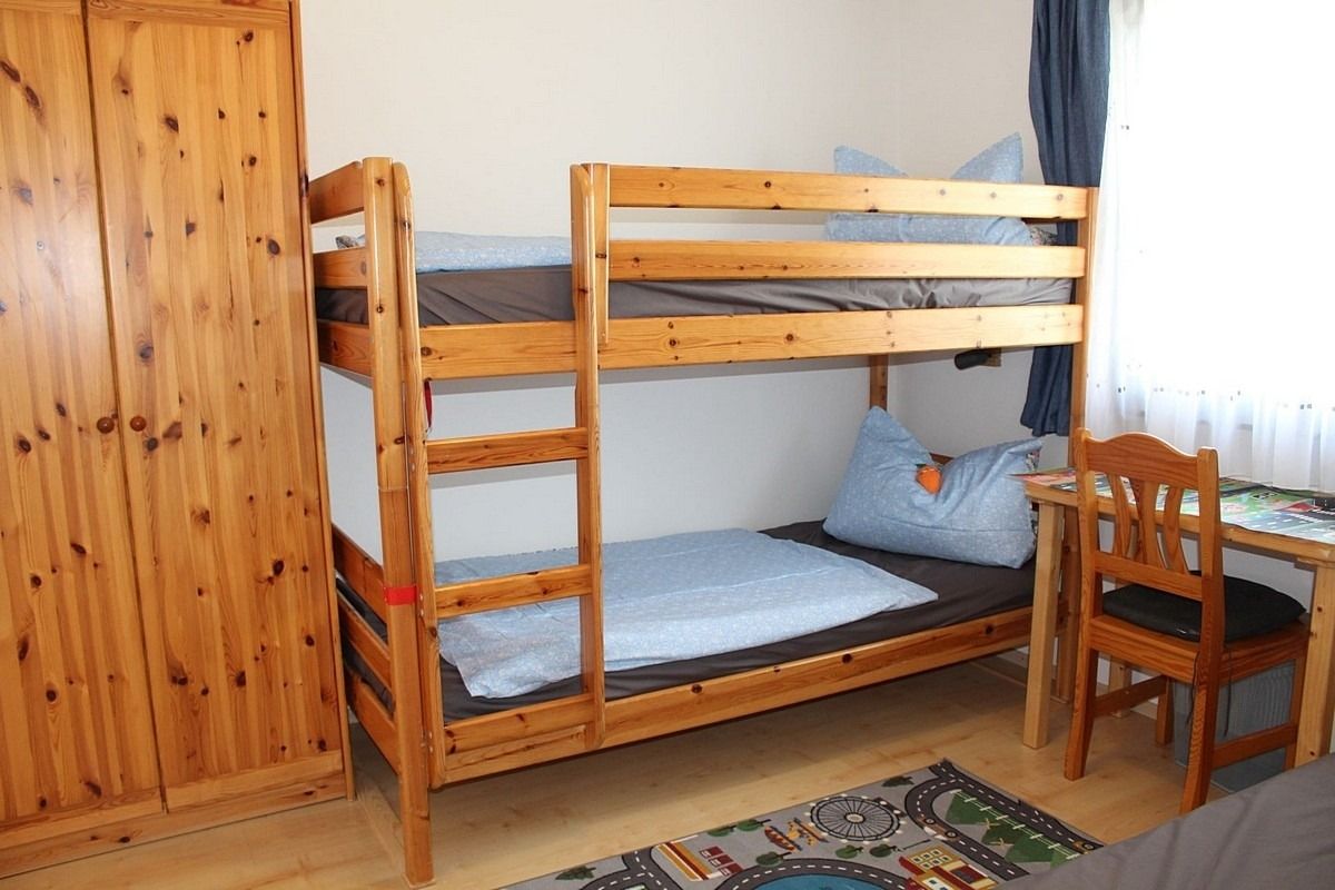 Kinderzimmer mit Stockbett, Einzelbett, Schrank und Schreibtisch, Spiele