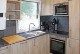 unsere Küche ist komfortabel ausgestattet mit Cerankochfeld, Backofen, Spülmaschine, Mikrowelle, Kühl-/Gefrierschrank, Wasserkocher, Kaffeepadmaschine und Filtermaschine, Toaster, Eierkocher und einem kleinen elektrischen WMF-Tischgrill (spülmaschinengeeignet). Der Grill befindet sich im Fach über dem Kühlschrank