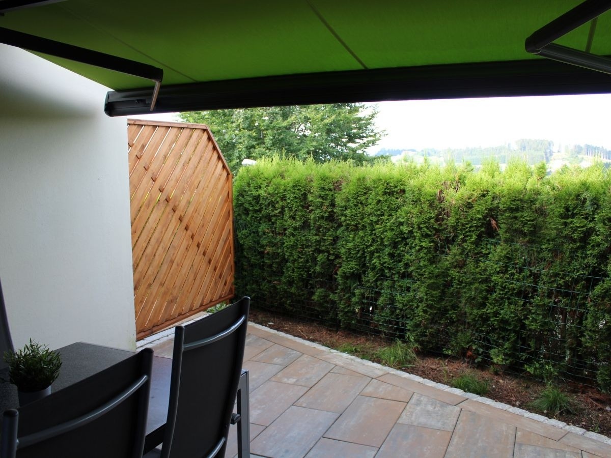 Die nach Westen ausgerichtete, nicht einsehbare Terrasse eröffnet einen herrlichen Ausblick auf den Auerberg und hat ab Mittag Sonne bis zum Untergang am Horizont.