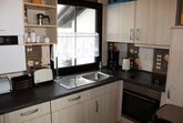 Voll ausgestattete Küche: großer Kühlschrank mit Gefrierfach, Herd (Ceranfeld), Dunstabzug, Geschirrspüler, Backofen, Wasserkocher, Toaster, Kaffeemaschine, Besteck, Geschirr, Gläser, Töpfe und alle gebräuchlichen Küchenutensilien.