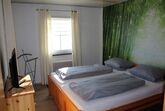 mit Doppelbett und geräumigem Kleiderschrank, Fernseher. Auch von diesem Zimmer aus haben Sie Zutritt zur Terrasse.