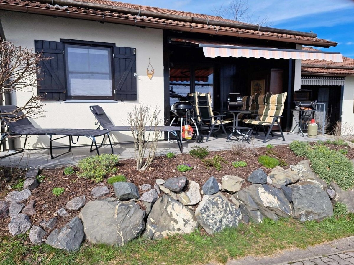 Die Süd-Terrasse ist geschmackvoll möbliert mit einem Gartentisch und Stühlen, sowie zwei Sonnenliegen. Zudem ist eine Markise für den Sonnenschutz vorhanden.