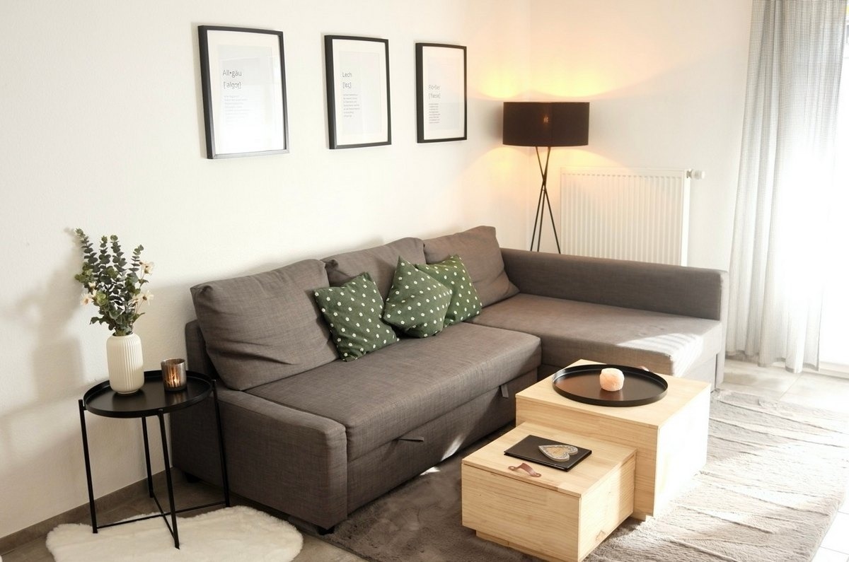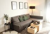 Das modern und gemütlich eingerichtete Wohnzimmer lädt zu gemütlichen Abenden mit einem gutem Film ein. Es bietet eine bequeme Couch mit Bettfunktion, einen LED Fernseher mit Soundbar, Stereoanlage, Bücher (auch Kinderbücher und Spiele). Vom Wohnzimmer aus gelangt man direkt auf die Terrasse.