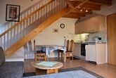 Das in Holzbauweise gebaute Ferienhaus Typ B1 ist ein 2-Zimmer-Maisonette-Appartementhaus für max. 4 Personen (ca. 50 qm, 1 Kinderbett für ein Kleinkind bis 2 Jahre kann zugebucht werden).
