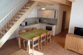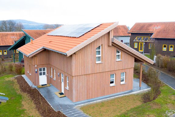 Das in Holzbauweise gebaute Ferienhaus Typ A3 ist ein 4-Zimmer-Maisonette-Appartement für max. 6 Personen (ca. 75 qm).