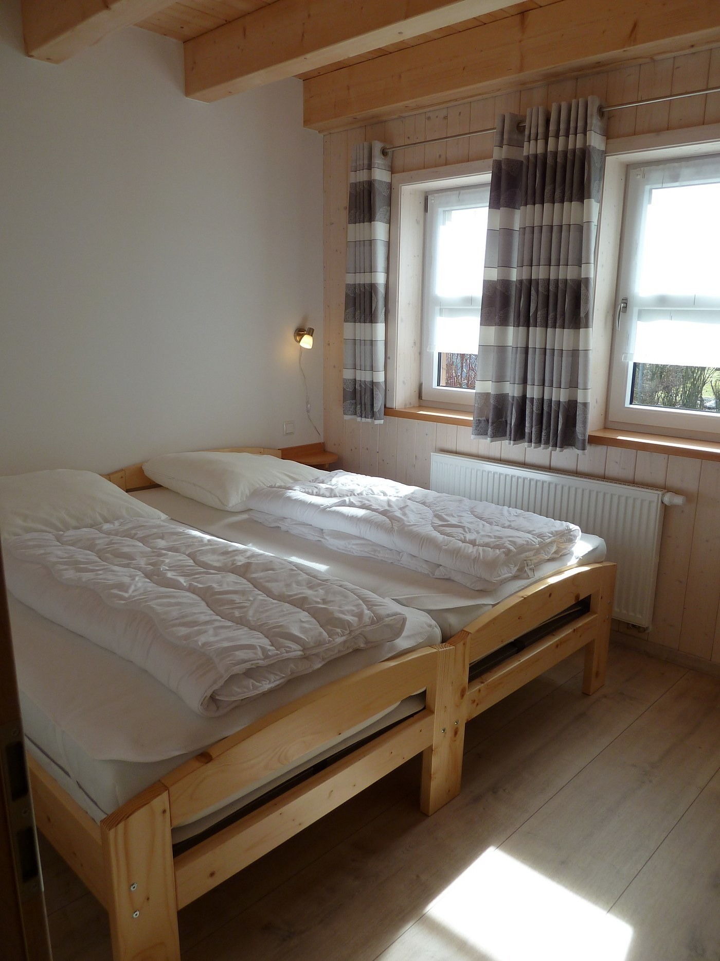 Im OG (über Treppe vom Wohnraum aus erreichbar): zwei Schlafzimmer mit gemütlich wirkender Dachschräge, davon eins mit Doppelbett und eins mit Einzelbetten, ein weiteres WC.