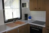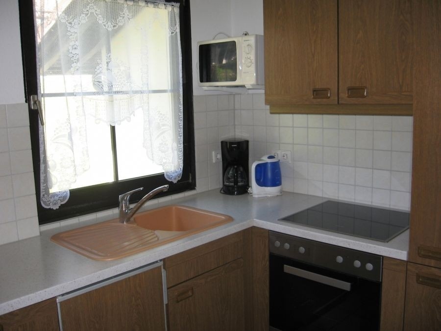 1 komplett ausgestattete Küche mit Backofen, Cerankochfeld, Wasserkocher, Mikrowelle, Spülmaschine und ausreichend Geschirr
