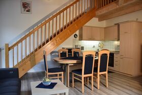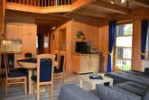 Das in Holzbauweise gebaute Ferienhaus Typ 3D ist ein 2-Zimmer-Maisonette-Appartementhaus für max. 4 Personen (ca. 50 qm, 1 Kinderbett für ein Kleinkind bis 2 Jahre kann zugebucht werden).