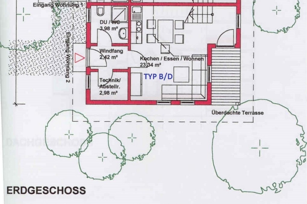 Duschbad/WC, Abstellraum, Ausgang zur möblierten Terrasse.