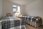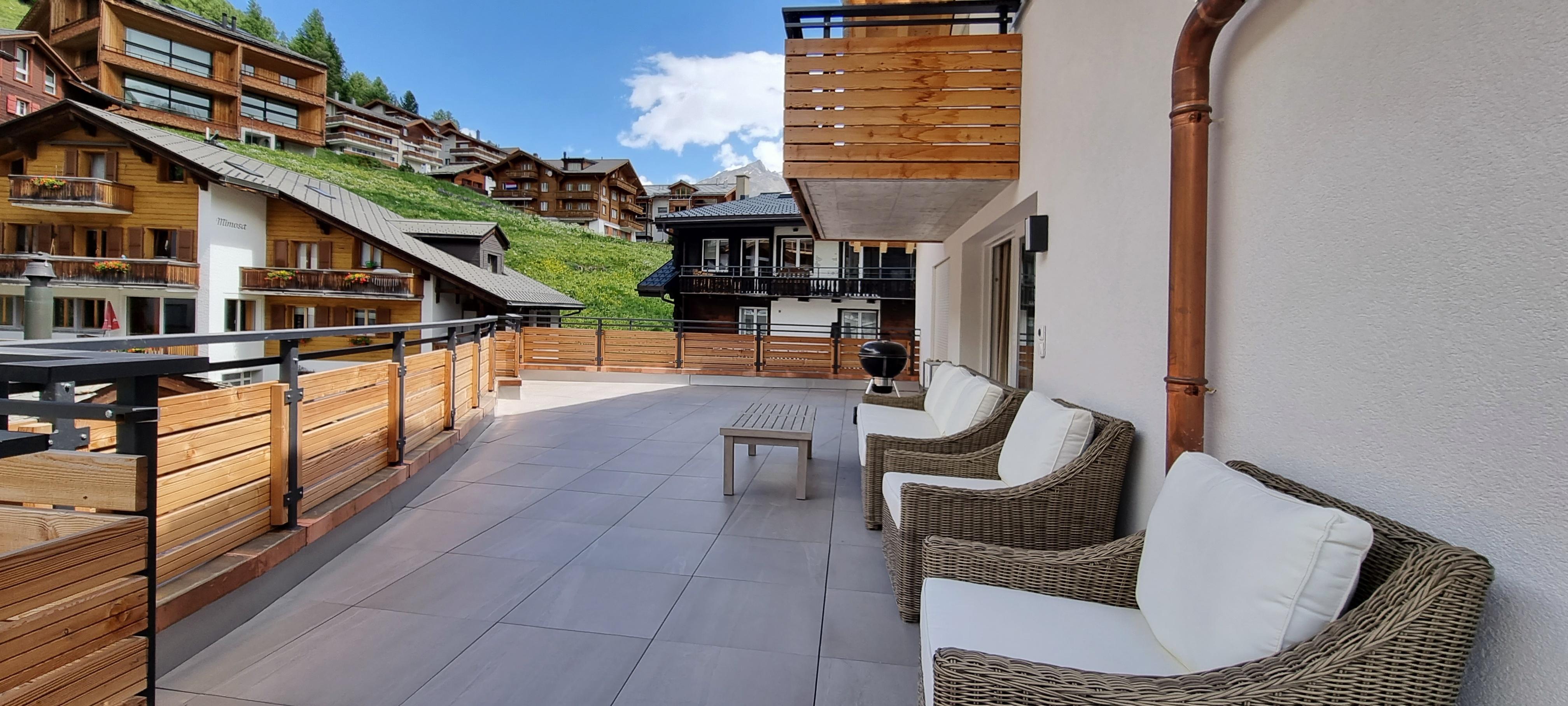 Im Sommer 2020 fertiggestellt befinden sich im Apartment Britannia 2 Schlafzimmer. 1 Schlafzimmer hat ein Doppelbett, das Zweite ist mit 2 Einzelbetten ausgestattet. Alle Betten sind komfortable Boxspringbetten. Beide Schlafzimmer verfügen über ein en-suite Badezimmer. Im Wohnzimmer befinden sich hochwertige Möbel und die offene und moderne Küche. Auch hat das Apartment einen privaten Waschturm. Highlight ist die riesengrosse Terrasse mit genialem Blick über Dorf und Berge.