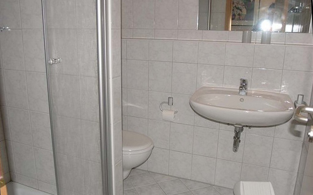 Im Badezimmer gibt es einen Waschtisch, eine Dusche und ein WC.