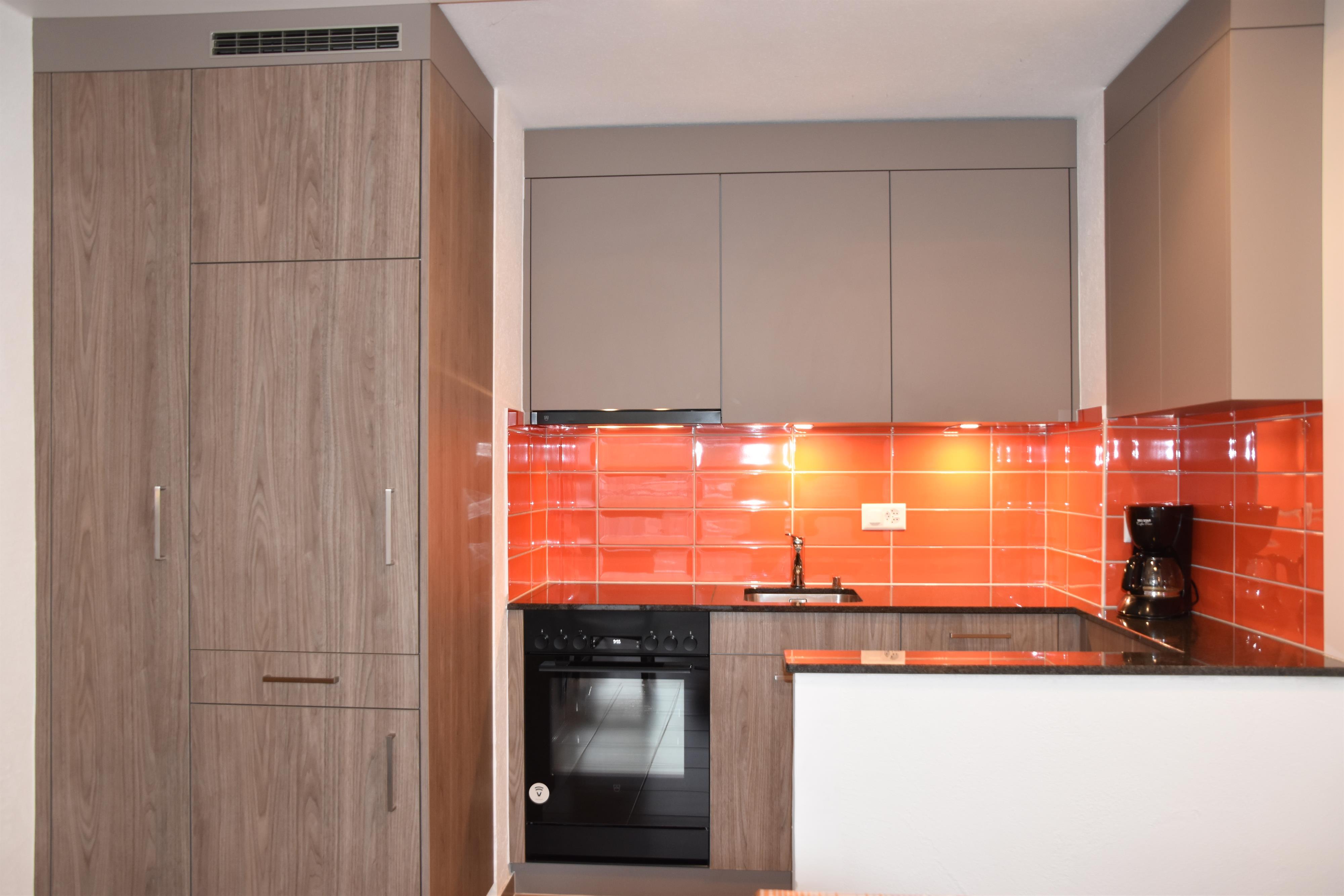 Kleine Küche mit Glaskeramikherd, Backofen, Kühlschrank, Filterkaffeemaschine. Die Küche ist vollständig und feriengerecht ausgestattet inkl. Küchenwäsche.