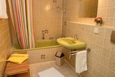 - ein Badezimmer mit Badewanne und Brausegarnitur, Waschbecken und WC sowie ausreichend Ablagemöglichkeiten
