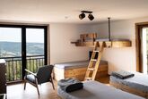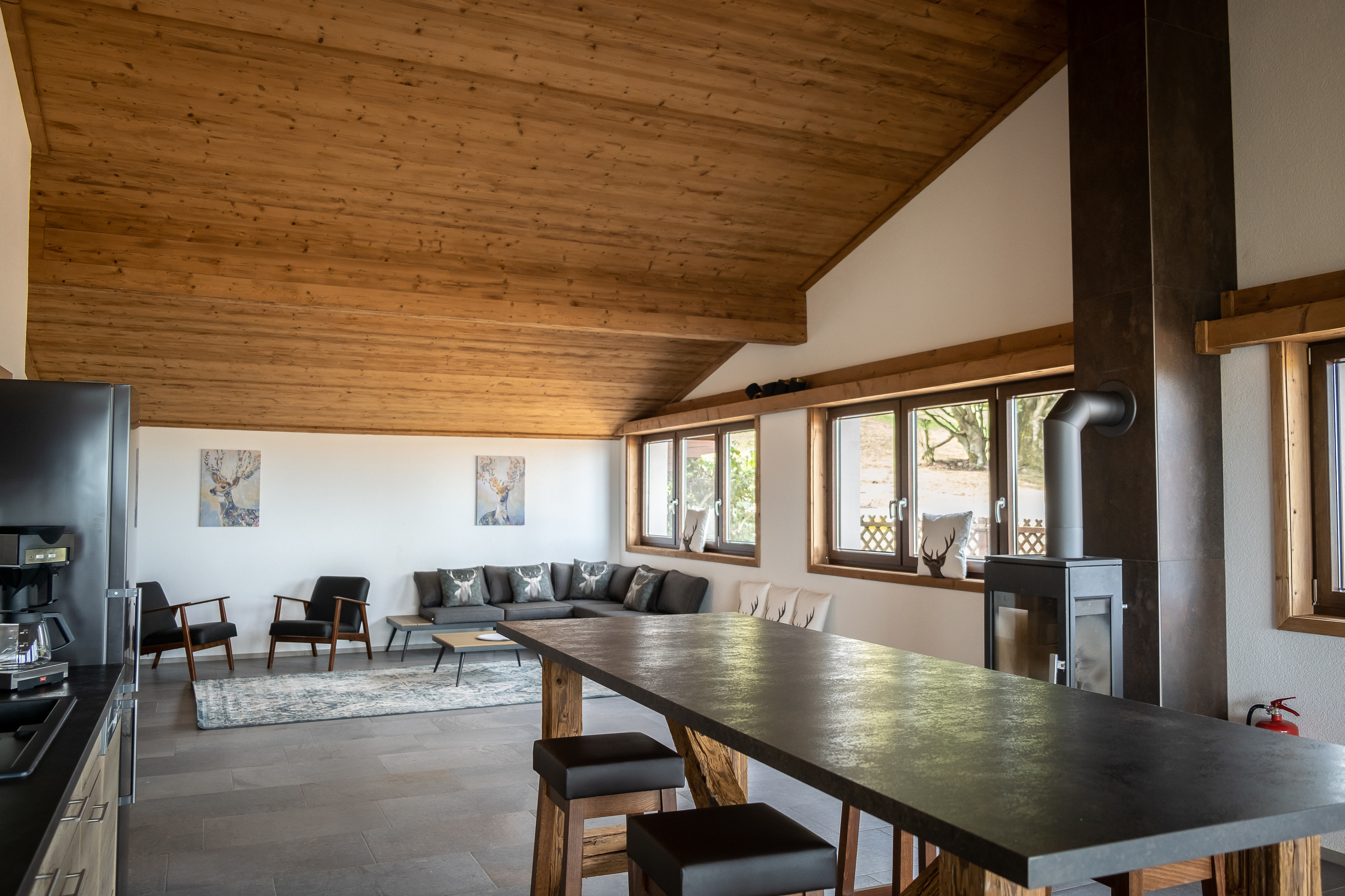 Unter anderem ausgestattet mit insgesamt 4 Schlafräumen mit je 4-5 Schlafplätzen und einem hochwertigem Matratzenlager mit romantischer Aussicht auf den Sternenhimmel, bietet unser Chalet somit Platz für maximal 20 Personen. Eine vollausgestattete und großzügige Küchenzeile im offenen Wohn- und Essbereich lädt zum gemeinsamen Kochen und Verweilen vor einer großen Panoramascheibe ein. Für die richtige Atmosphäre und Gemütlichkeit sorgt ein Holzofen mit Glasscheibe im Wohnbereich sowie ein Grillplatz mit Feuerstelle auf der großzügigen Außenfläche vor der Alm. Insgesamt verfügt die Alm über 3 moderne Bäder mit großer Panoramadusche. Für Kinder steht ein kleiner Spielplatz zur Verfügung. Von der Haflinger Alm aus können Sie viele schöne Wanderungen durch die Rhön starten, oder im Winter Ski fahren. Eine kostenfreie Parkmöglichkeit befindet sich direkt vor dem Chalet. Nach ca. 6,5 km erreichen Sie die kleine Stadt Bischofsheim mit einer schönen Altstadt und Einkaufsmöglichkeiten.