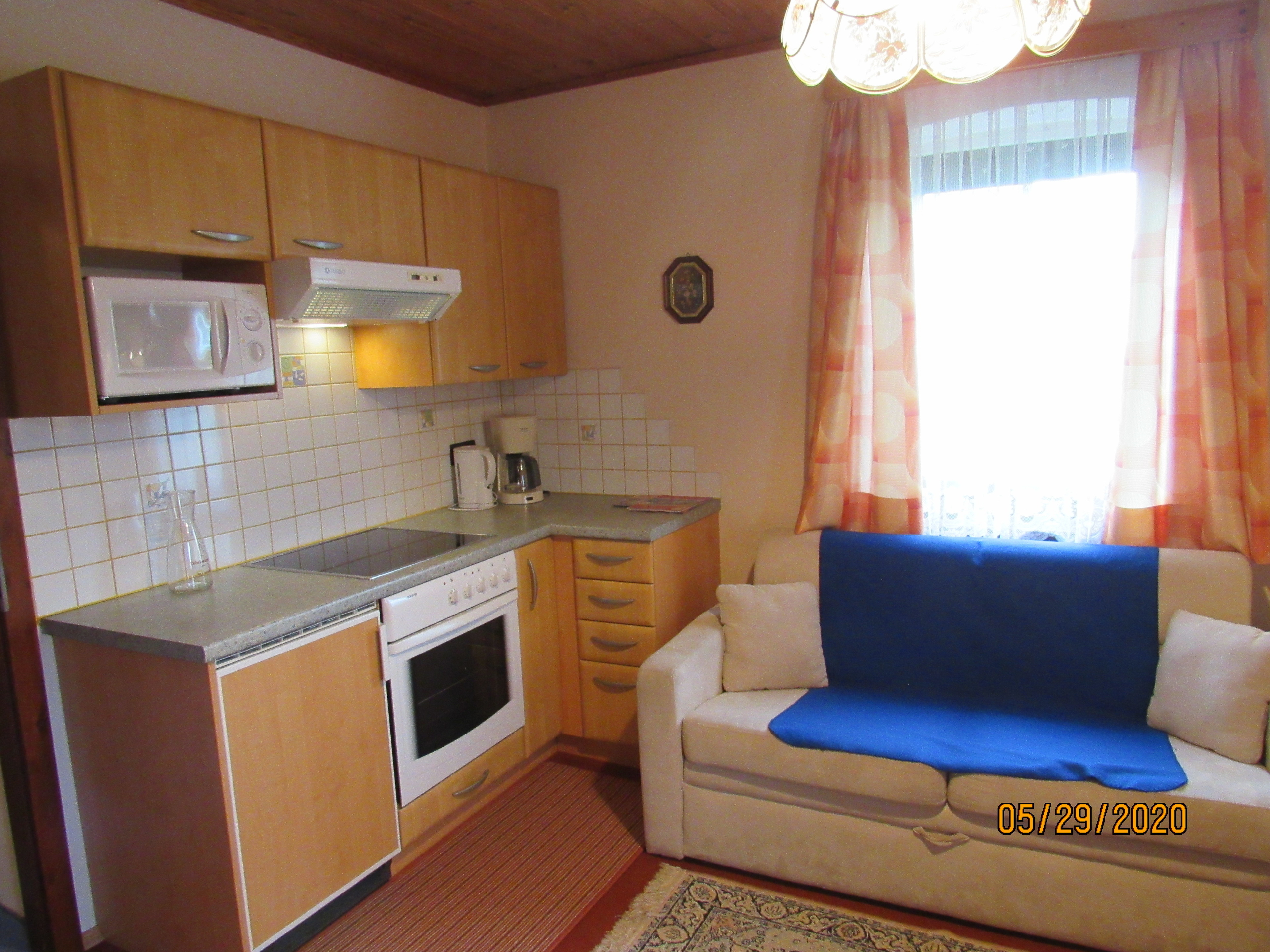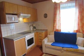 In der gut ausgestatteten Küche finden Sie neben einem Kühlschrank auch eine Mikrowelle und einen Backofen.