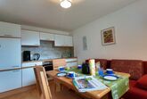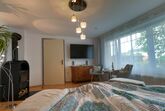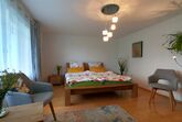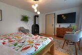 Die Ferienwohnung mit der gut ausgestatteten Küche bietet geräumig Platz für zwei bis drei Personen, gerne auch für eine kleine Familie. Kinderhochstuhl, Kinderbettzeug, Kinderessgeschirr und Spielsachen für drinnen und draußen sind vorhanden. Im Wohn/Schlafzimmer ist das Aufstellen eines Reisebettes gut möglich. Oder Sie ziehen die Möglichkeit vor, in zwei Räumen zu nächtigen: Dies ist mithilfe der hochwertigen Schlafcoach in der Küche, die über eine komfortable Liegefläche von 140cm x 200cm verfügt, gut möglich. (Nicht nur) Senioren freuen sich über die Parkmöglichkeit auf dem Grundstück und die ebenerdige Lage der Ferienwohnung, die auch im Hochsommer angenehm kühl bleibt. Wollen Sie es romantisch, dann nehmen Sie den Kaminofen im Wohn/Schlafzimmer in Betrieb. Ihr Heizen sonst ist emissionsfrei, denn die Wärme aus den Heizkörpern stammt von der Wärmepumpe, die ihren Strom wiederum von der hauseigenen Photovoltaikanlage bezieht, ergänzt durch echten Ökostrom. Die auf dem Dach befindliche Solarthermie erwärmt Ihr Duschwasser. Eine in der Ferienwohnung befindliche Waschmaschine ermöglicht einen komfortablen, längeren Aufenthalt.