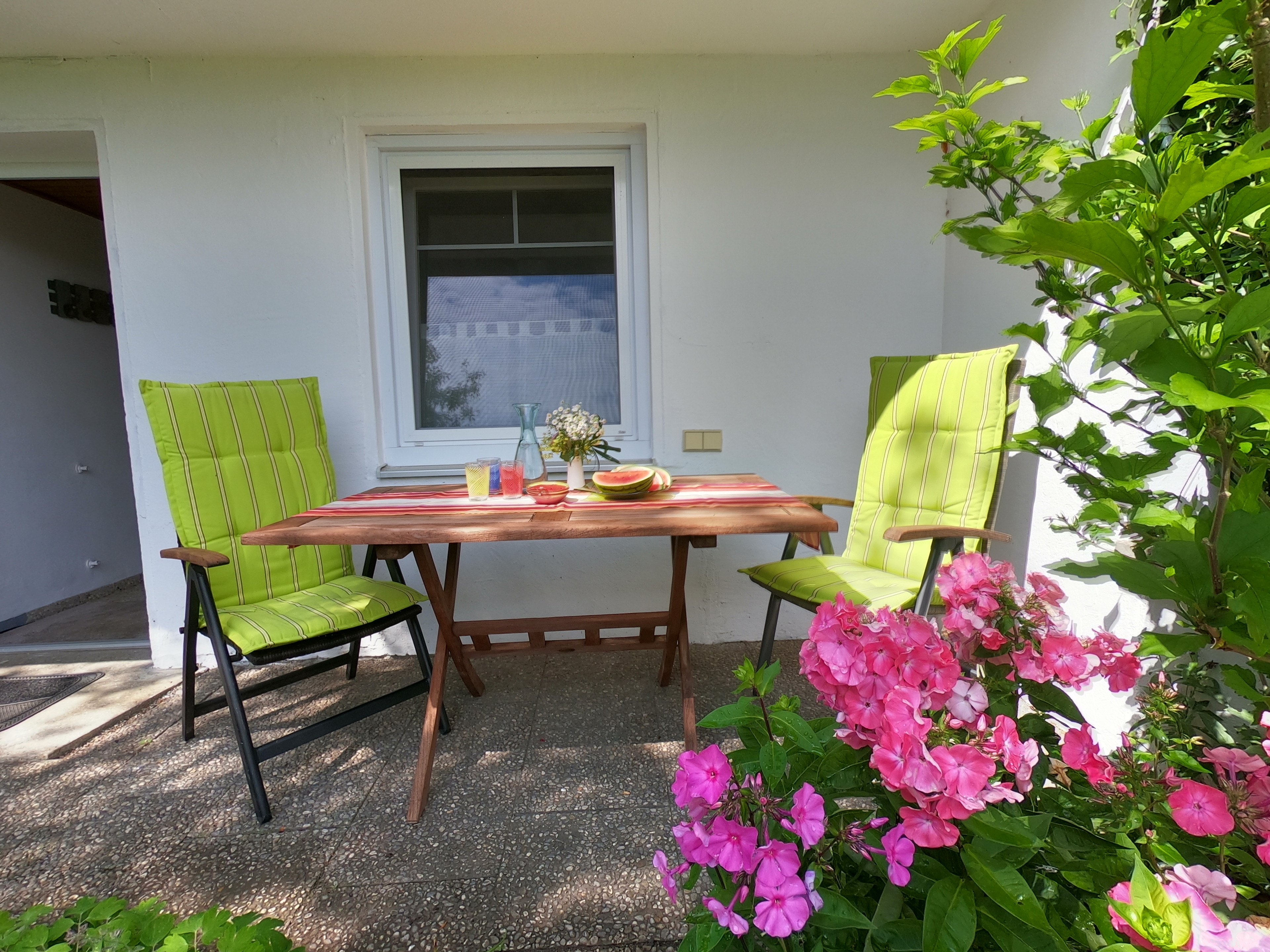 Der sich an die Terrasse anschließende Garten ist naturnah gestaltet und konsequent ökologisch gepflegt: In den Beeten wachsen einheimische, insektenfreundliche Stauden, das Gartenhäuschen hat eine Dachbegrünung und die Gartenbewässerung erfolgt mit Regenwasser, das mittels Pumpe aus der Zisterne gefördert wird. Für Ihre Entspannung im Garten auf der Liegewiese stehen Liegen mit Auflagen zur Verfügung.