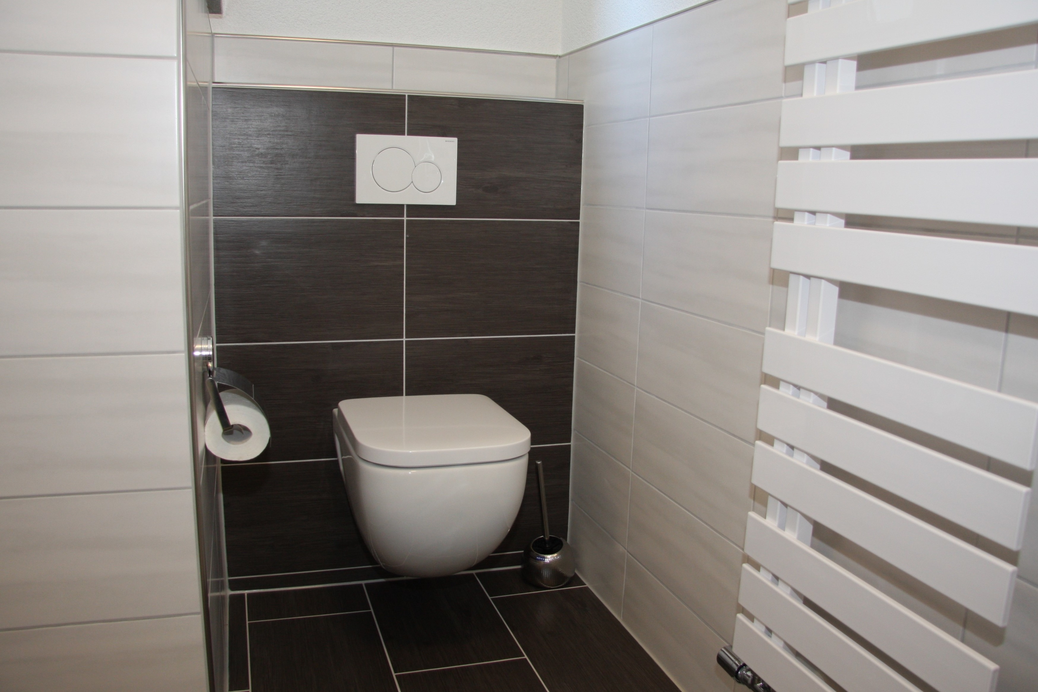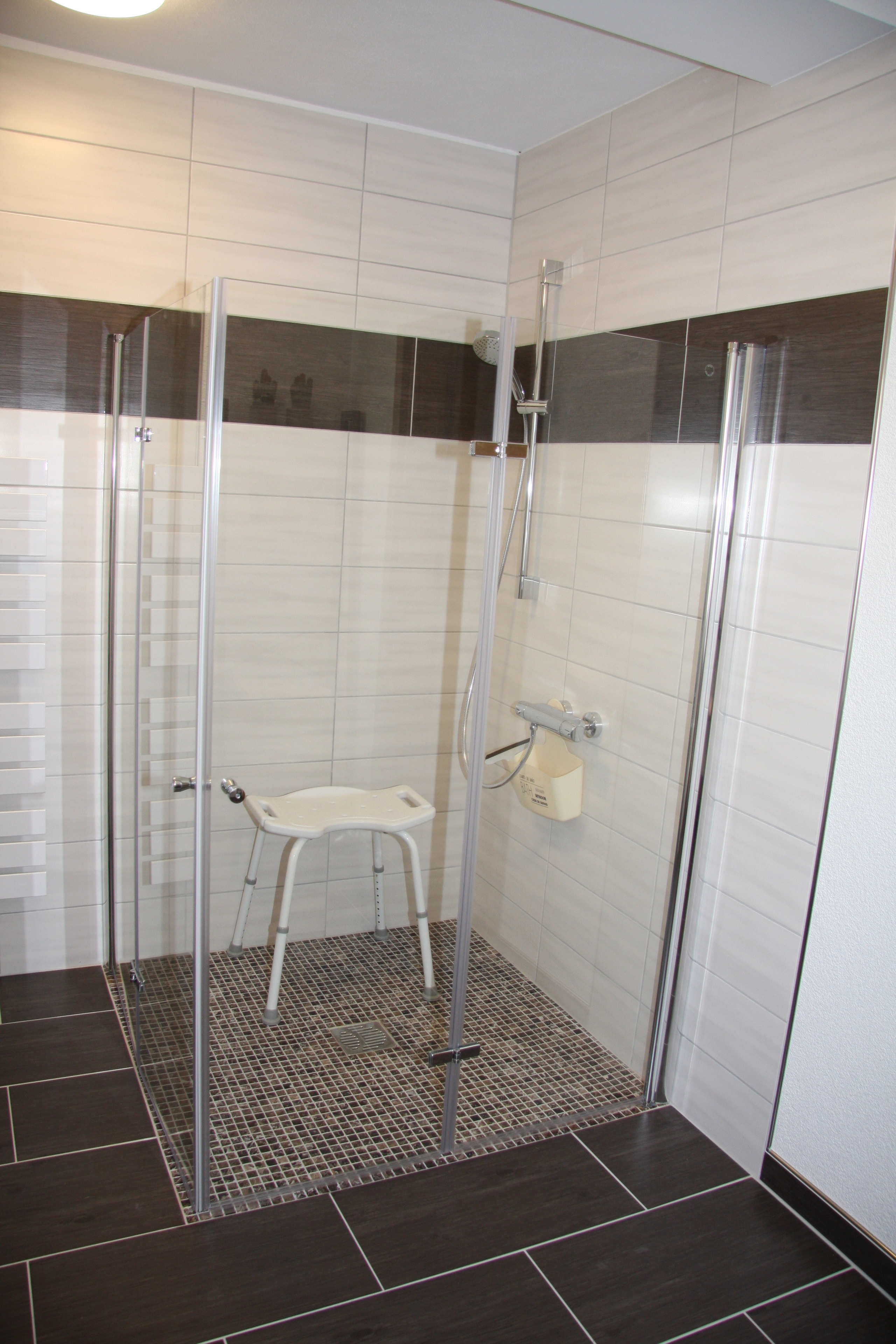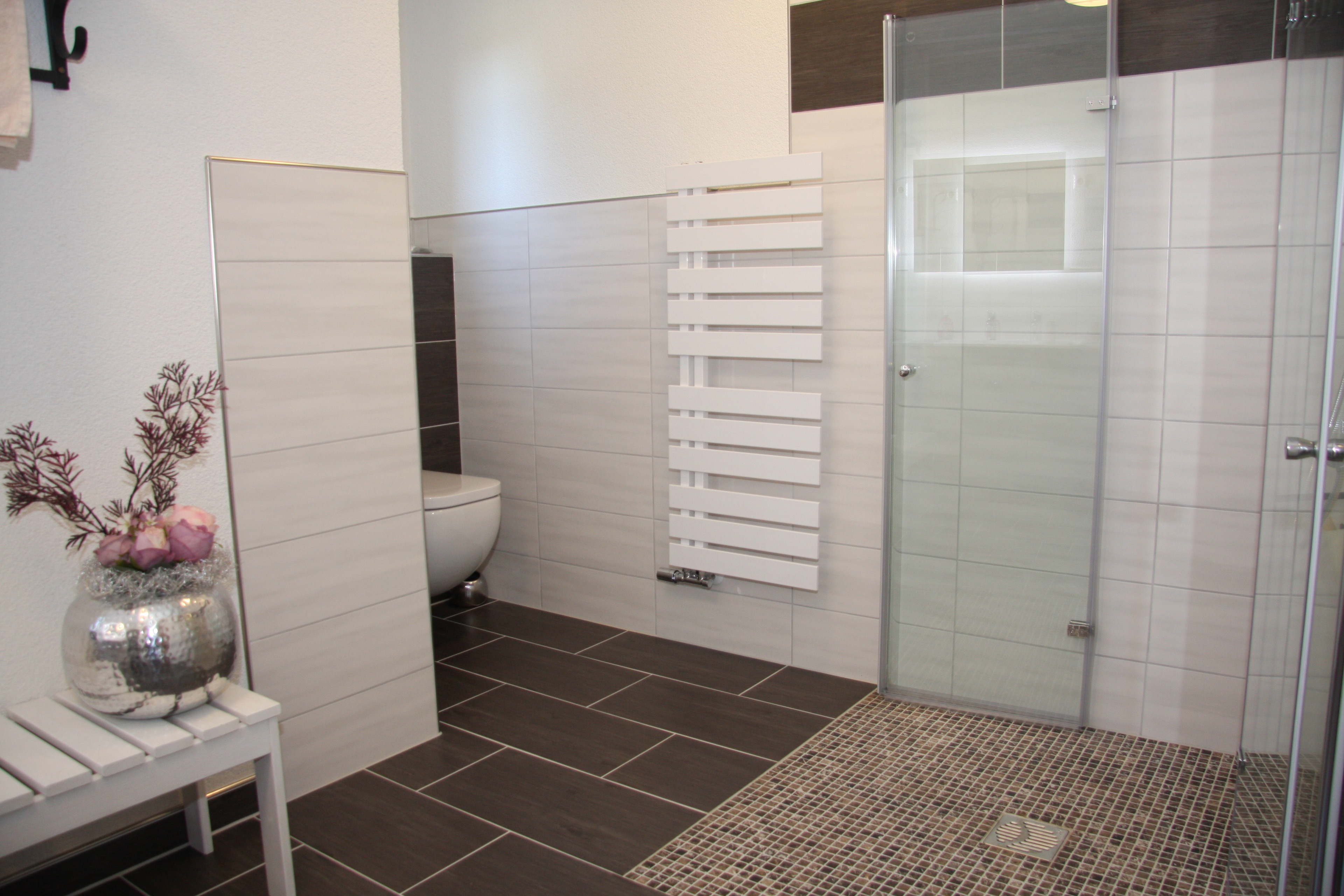 Badezimmer (ebenerdige Dusche, 1,20 m x 1,20 m, unterfahrbares Waschbecken, Toilette)