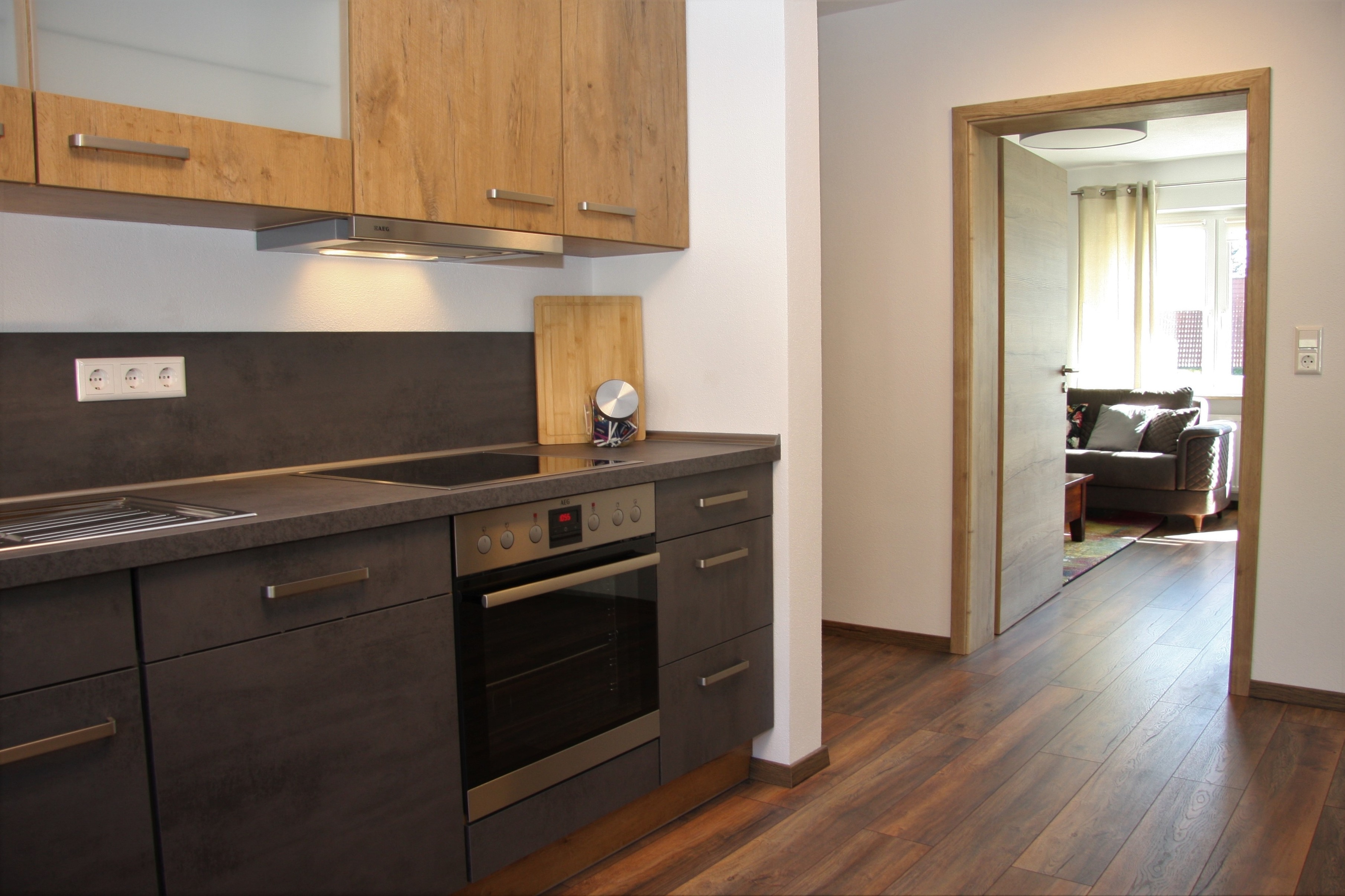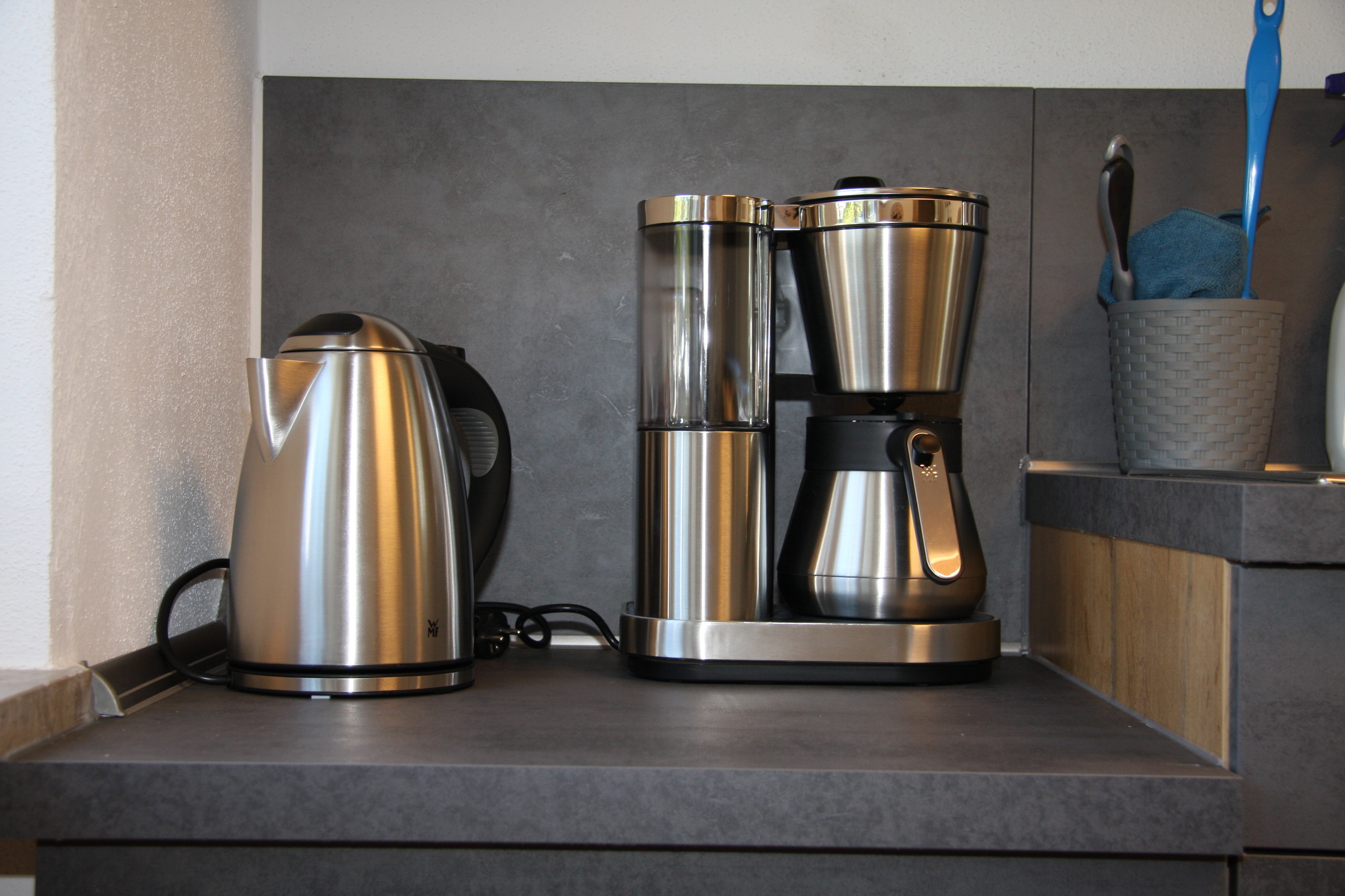 Küche (mit Herd, Backofen, Wasserkocher, Kaffeemaschine, Spülmaschine, Kühlschrank),