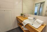 The comfortable, modern furnished apartment for up to 4 persons is located on the upper floor of a newly built building and consists of a bedroom, a kitchen-living room (stove with oven, dishwasher, toaster, kettle), a bathroom and a spacious balcony.