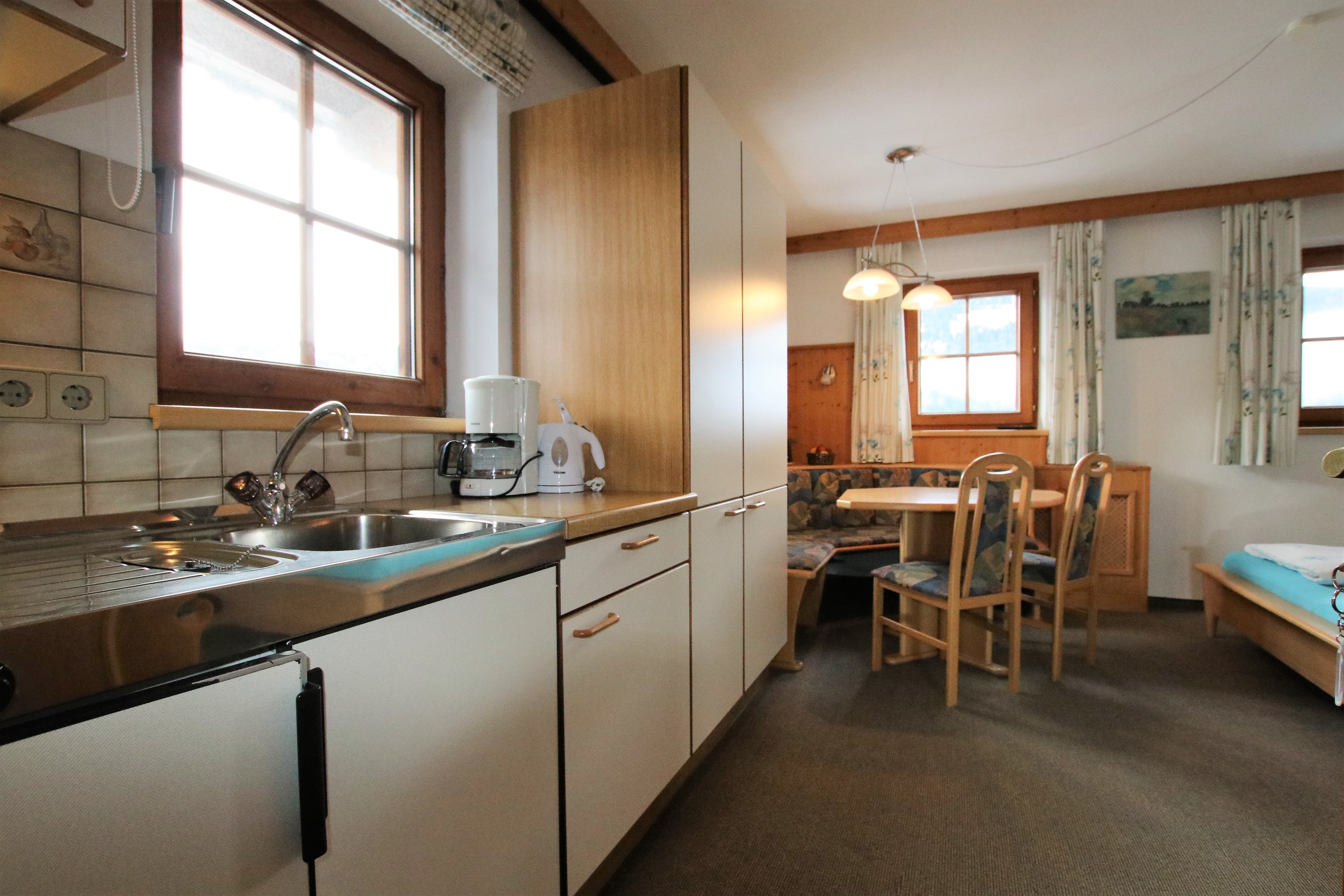 Über einen gemeinsamen Hausflur gibt es einen Zugang zum Balkon mit Sitzmöglichkeiten für 2 Personen. Abstellmöglichkeiten für Fahrräder oder Ski sind vorhanden. (Panoramablick.) Weitere Wohnung bis 6 Personen im Haus.