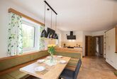 NEU! 4-Zimmer-Wohnung im Obergeschoß (internes Treppenhaus) eines wunderschönen Chalets: Wohnfläche ca. 120 m². Wohnzimmer mit Couch und TV. Separate Küche mit Essplatz (Eckbank), TV und Terrassenausgang. Küche mit Einbauherd (4 Platten, Backofen), Geschirrspüler, Kühlschrank, Kaffeemaschine, Wasserkocher, Toaster. Abstellraum. 2x Doppelzimmer. 1x Einzelzimmer. Großes Bad mit Wanne, Dusche und Doppelwaschbecken. 1x Sep.WC.
