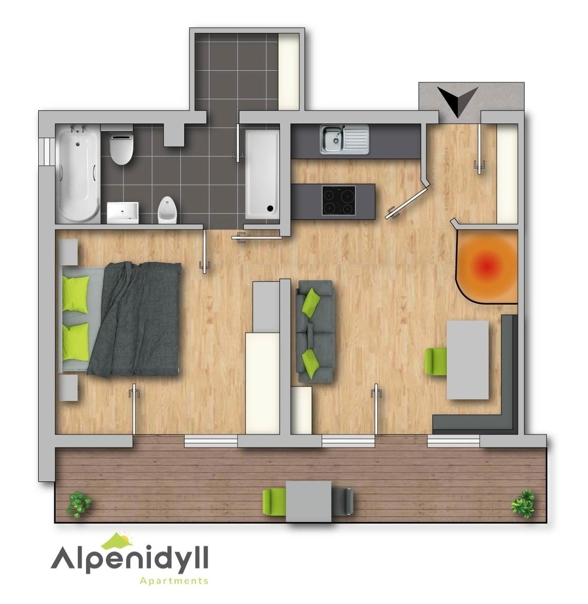 Mit einer Größe von ca. 47m² , einem Schlafzimmer, einem Bad und einer Wohnküche mit einer ausziehbaren Couch bietet es Ihnen Platz für insgesamt 4 Personen.