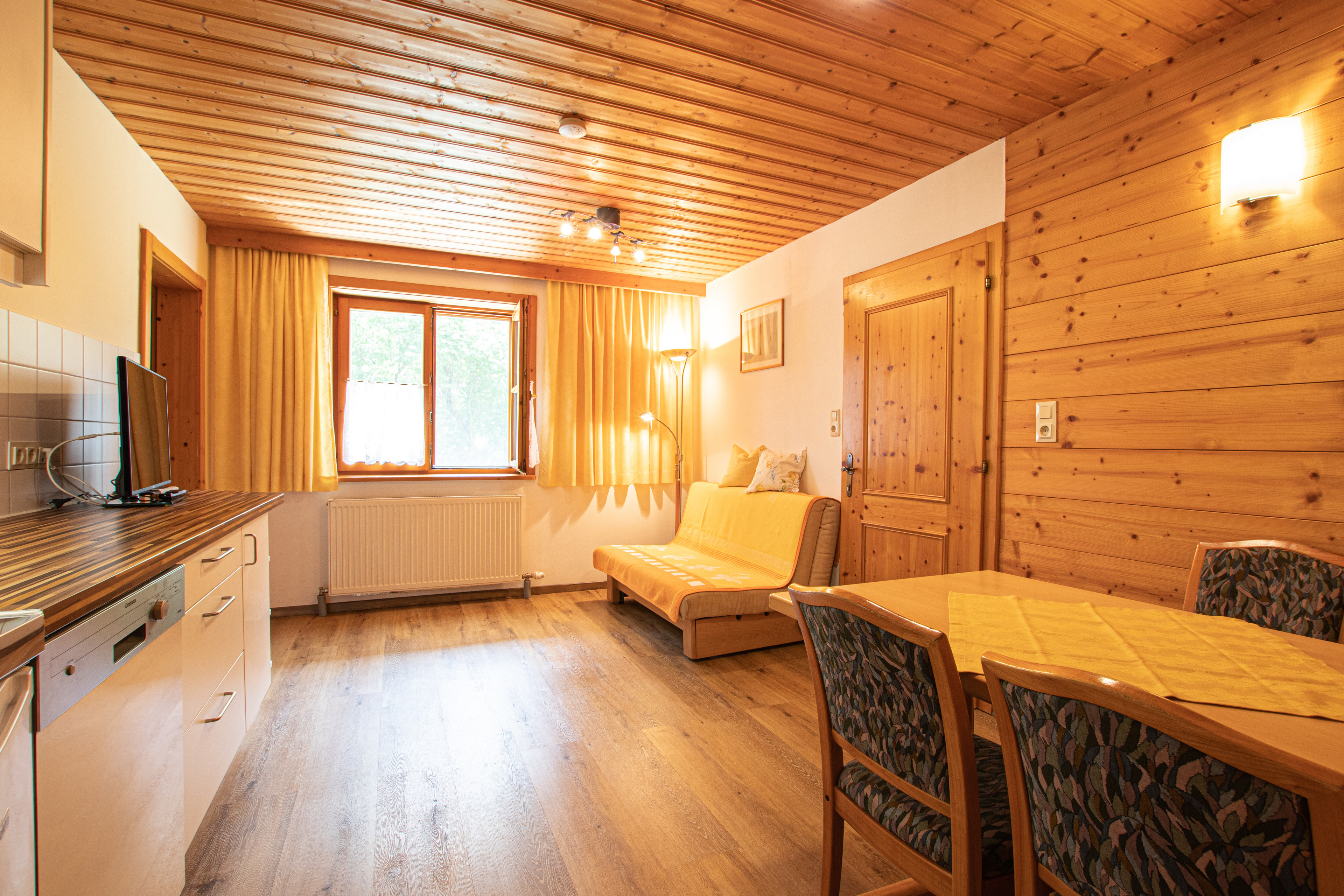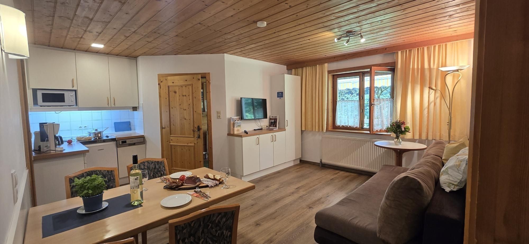 Zwei Einliegerwohnungen im Erdgeschoss mit insgesamt 2 Zimmern pro Wohnung, jede Wohnung ca. 45m² für maximal je 3 Personen und einem Kleinkind. Je Wohnung ein Schlafzimmer mit Doppelbett und einem Einzelbett, je Wohnung ein Wohn-/Schlafraum mit Schlafcouch, Essplatz mit Tisch und 4 Stühlen, Kochnische Ausgestattet mit Geschirrspüler, Kühlschrank, Kaffeemaschine, Wasserkocher, Toaster und Mikrowelle. 6 Erwachsene Personen maximal Belegung für beide Wohnungen zusammen, zusätzliches Kinderbett gerne auf Anfrage. Die beiden Wohnungen sind durch einen gemeinsamen Hausflur getrennt.
