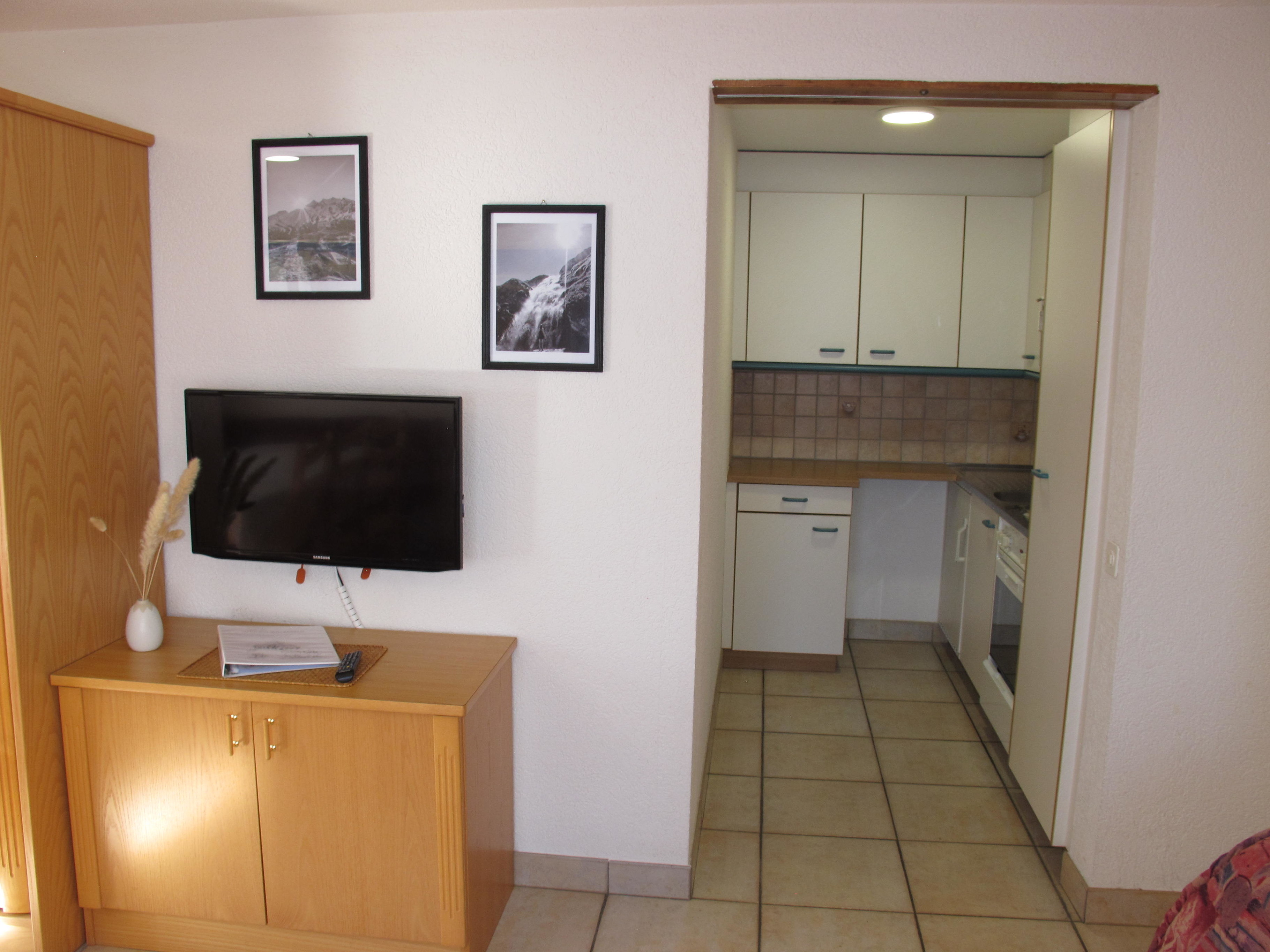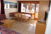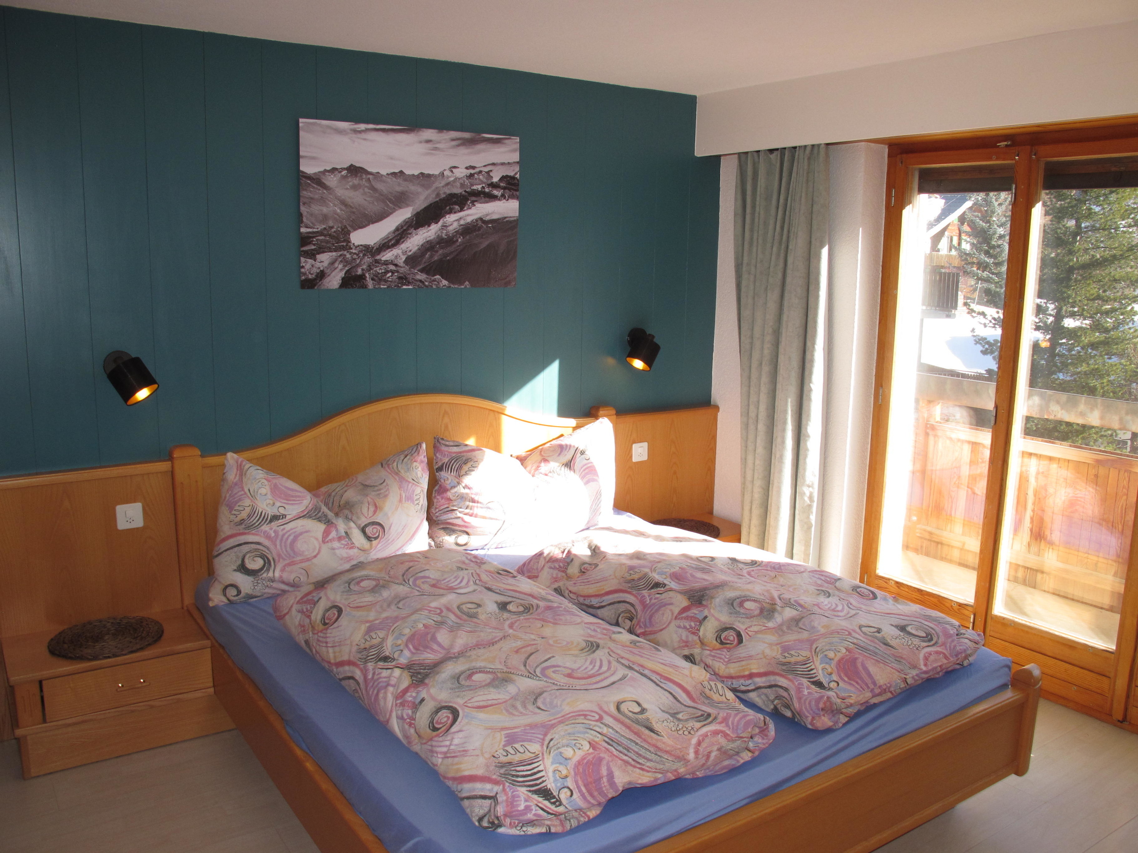 3-Zimmer-Wohnung, 1., 2. oder 3. Etage, 55 m². Eingang in Flur mit Garderobe. Großer Wohn-/Schlafraum mit 2x Couchbett/Sitzgruppe, Eßplatz mit Eckbank und offene Küche mit Einbauherd (3 Platten, Backofen), Mikrowelle, Kühlschrank, Kaffeemaschine, Wasserkocher, Fondue-Rechaud und Balkon (herrlicher Blick auf die Bergwelt und Lärchenwald). Großes Doppelzimmer mit Waschbecken, Balkon. Kleines Doppelzimmer (Bett 1,40 m breit), Balkon. Bad/WC oder Dusche/WC.