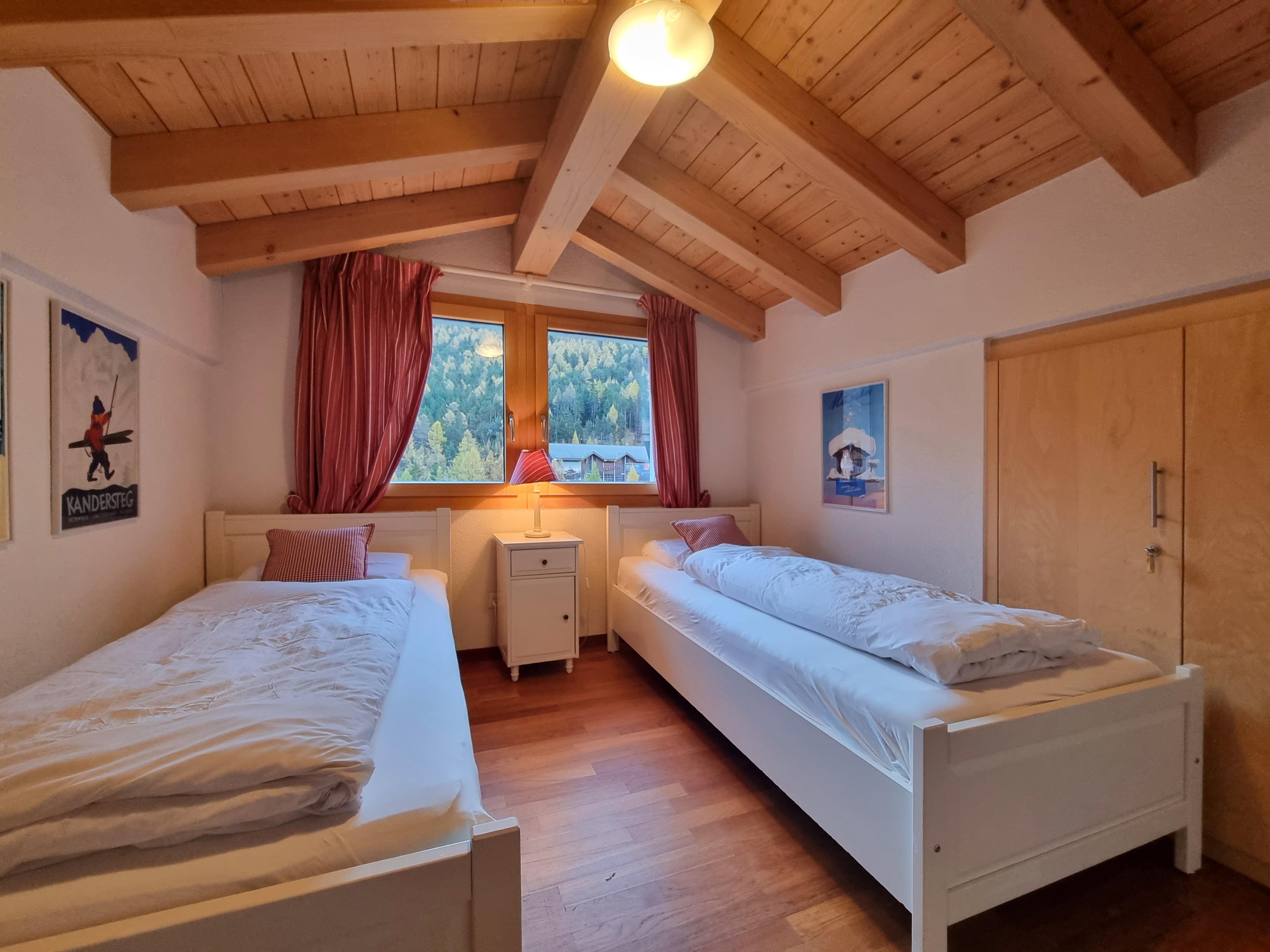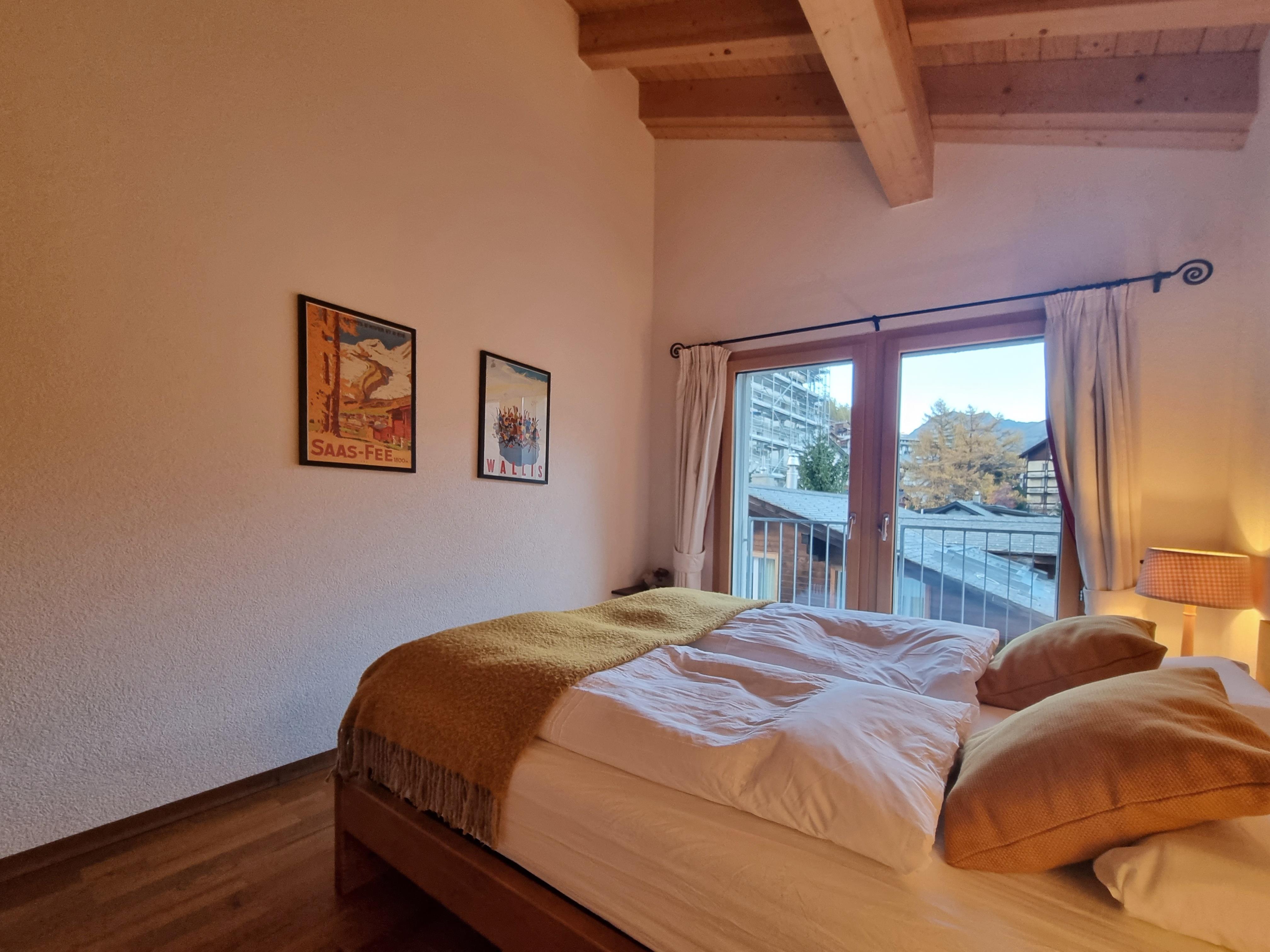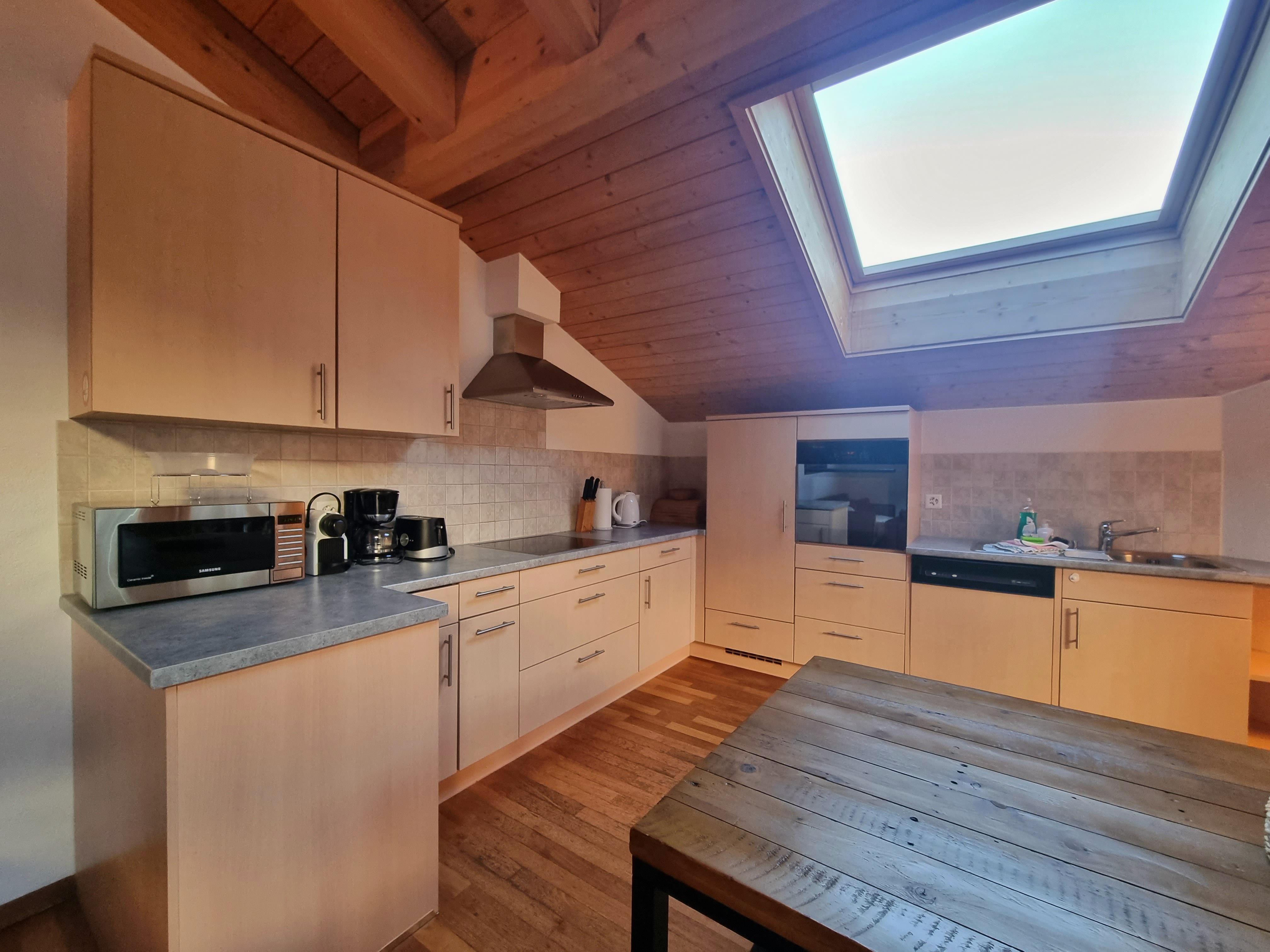 4-Zimmer-Attikawohnung, geräumig, hell, offenes grosses Wohn-/Esszimmer mit offenem Kamin. Ausgang zum Südbalkon. 2 Doppelzimmer, jedes Zimmer mit 1 Doppelbett. 1 Zimmer mit 2 Betten. Offene Küche (Backofen, Geschirrspüler, Glaskeramikherd, Mikrowelle, elektrische Kaffeemaschine). Bad/WC, Dusche/WC. Panoramasicht. Zur Verfügung: Internet (Wireless LAN).