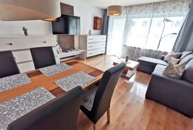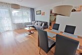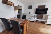 Eine separate Küche mit Kaffeefiltermaschine, Wasserkocher, Toaster, Kochfeld, Kühlschrank mit 3***-Gefrierfach und Backofen ist ideal, um sich ein Frühstück auf dem Balkon oder ein leckeres Abendessen zuzubereiten. Im Wohnzimmer befindet sich übergroße Ledercouch als Schlafmöglichkeit für eine Person bis 190 cm sowie Essplatz für 4 Personen.