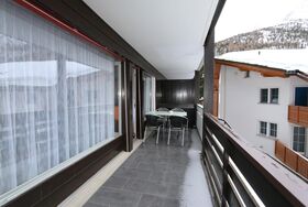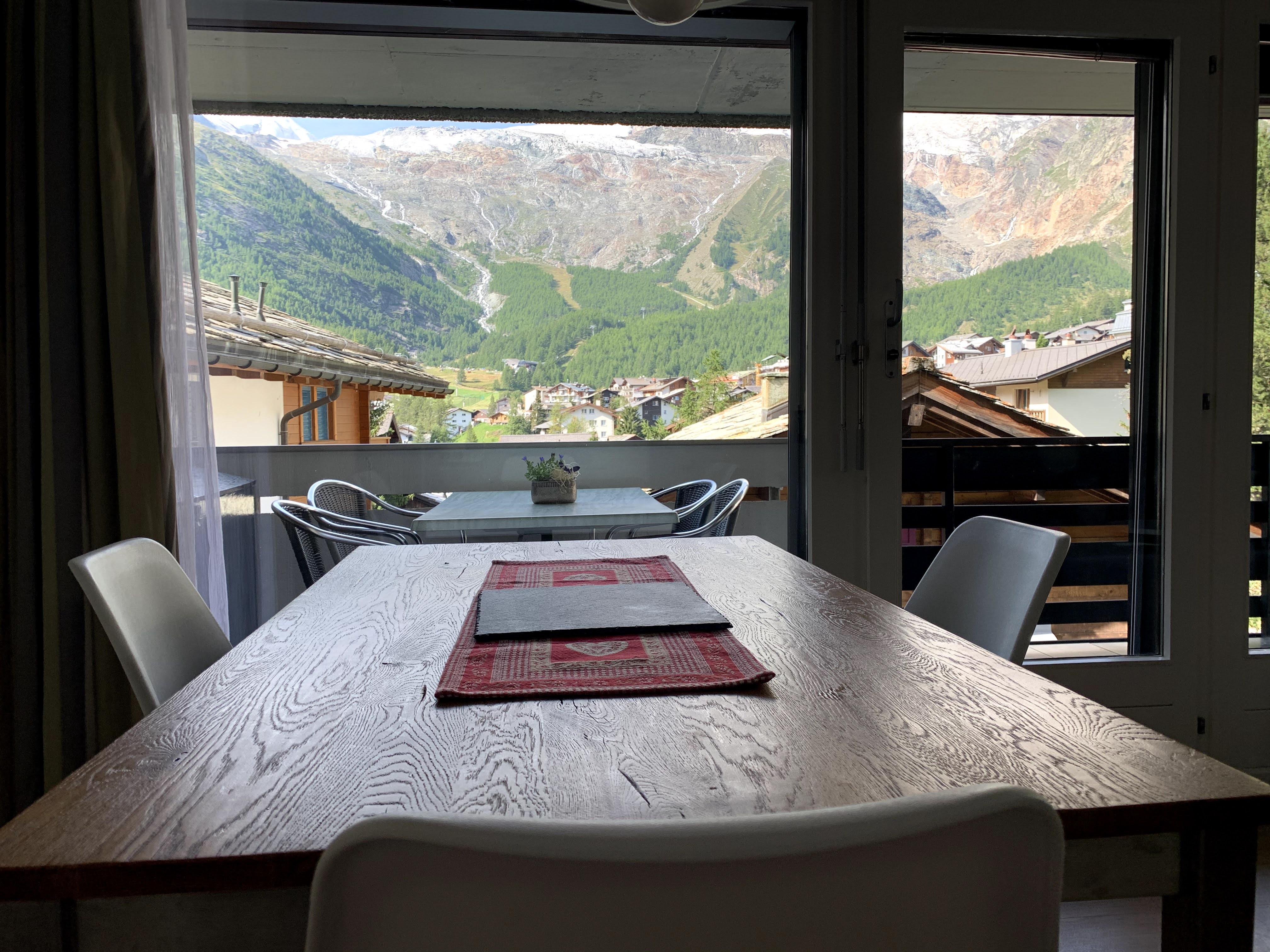 Vom südlich ausgerichteten Balkon aus hat man eine wunderschöne Aussicht über Saas-Fee und die Berge.