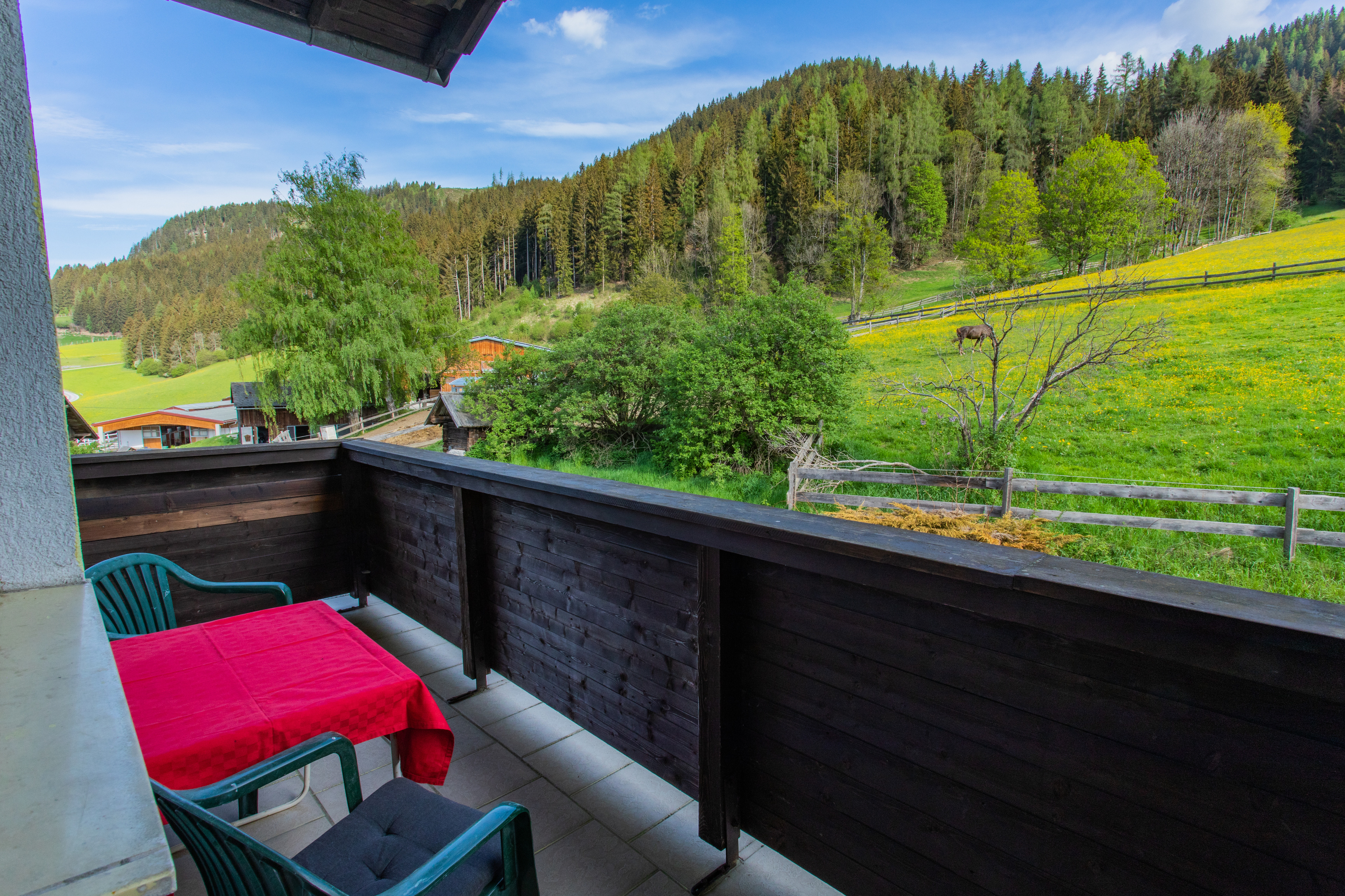 The Huberhof is a cozy, alpine apartment house in a quiet, idyllic location. Characteristic among other things, the unobstructed view of meadows and forests, the immediately adjacent area of an equestrian farm and the possibility of taking dogs as fellow travelers in all apartments. The respect of their owners to the non-dog owners provided.