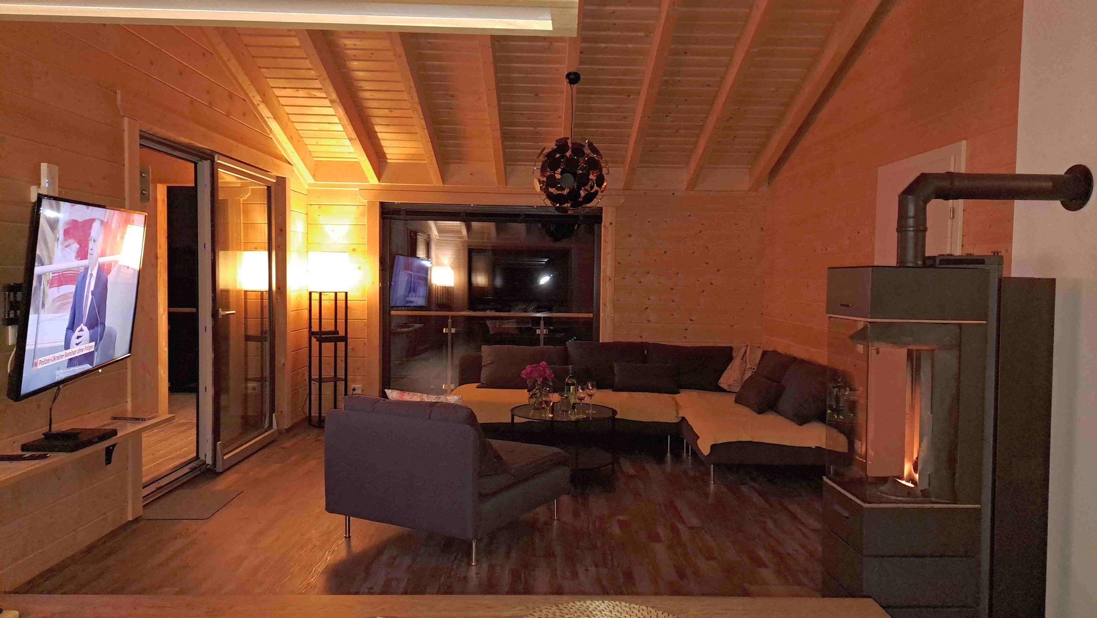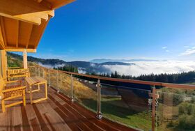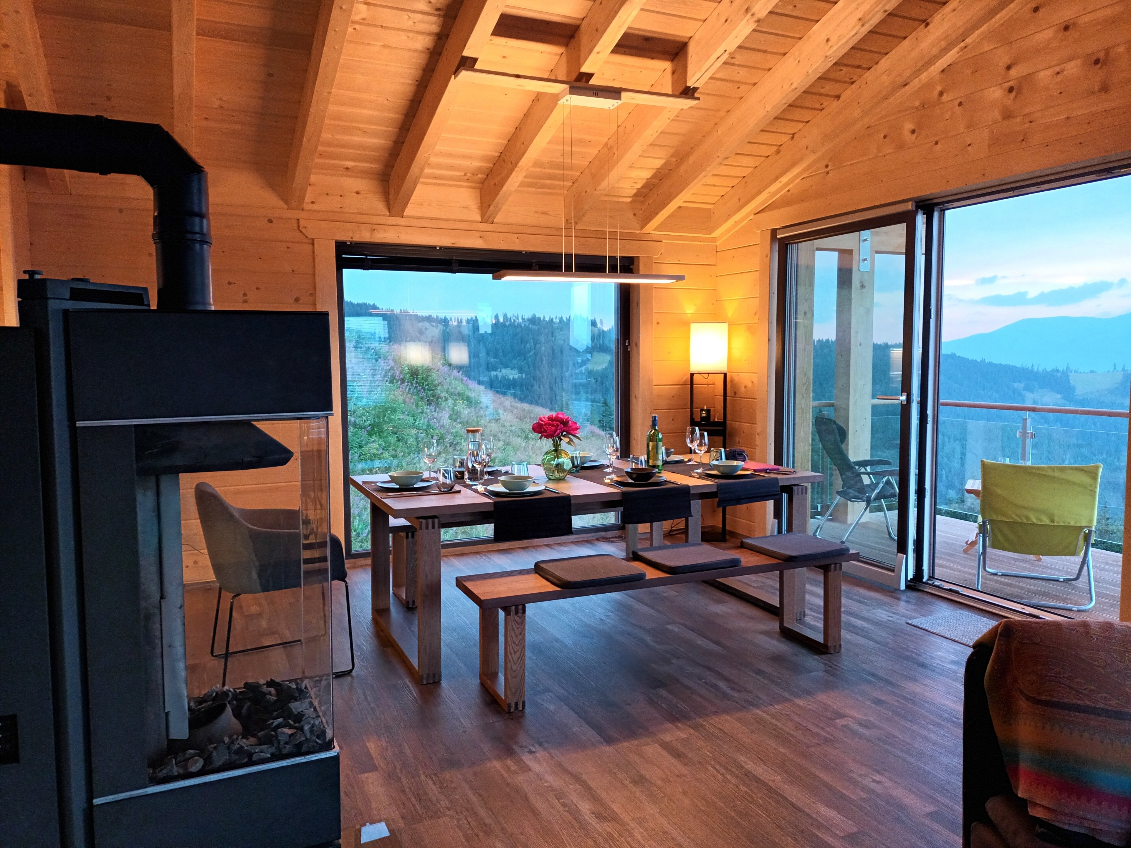 - 270 Grad Rundum-Panoramasicht aus raumhohen Fenstern und Türen des großzügig gestalteten Wohn-/Ess-/Kochbereichs im OG; die Panoramasicht ergibt sich durch die spezielle Hanglage der Almlodge; an wolkenlosen Tagen beträgt die Fernsicht 30 Kilometer und mehr, an bedeckten Tagen befindet man sich abgehoben über den Wolken.