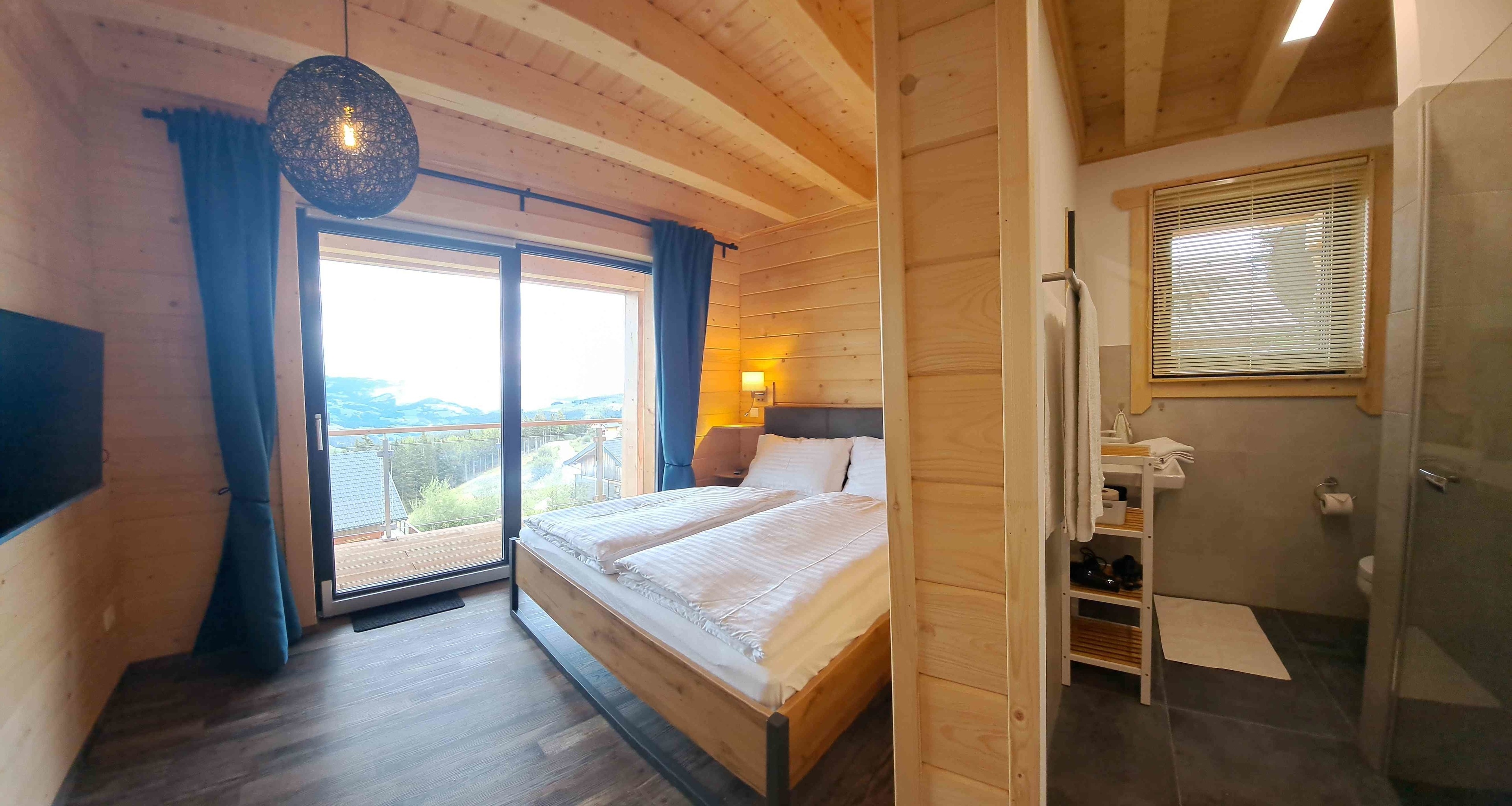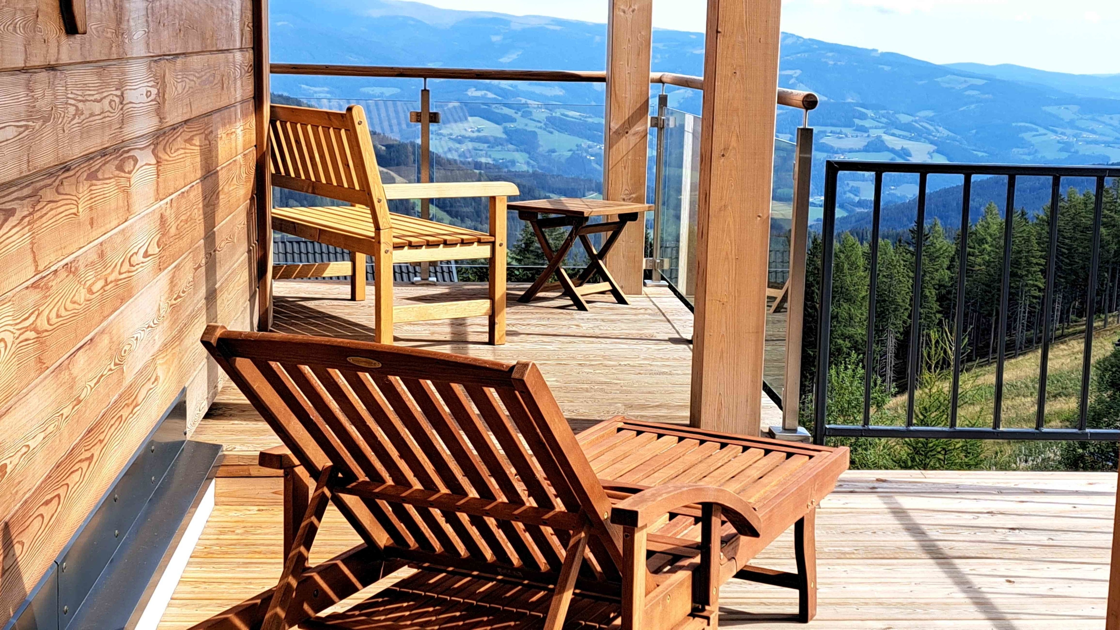 - Zweiseitig umlaufender Balkon auch vor dem Schlafbereich lädt mit Bänken zum Verweilen oder zur morgendlichen Gym/Yoga Einheit gleich aus dem Bett in die frische Almluft ein.