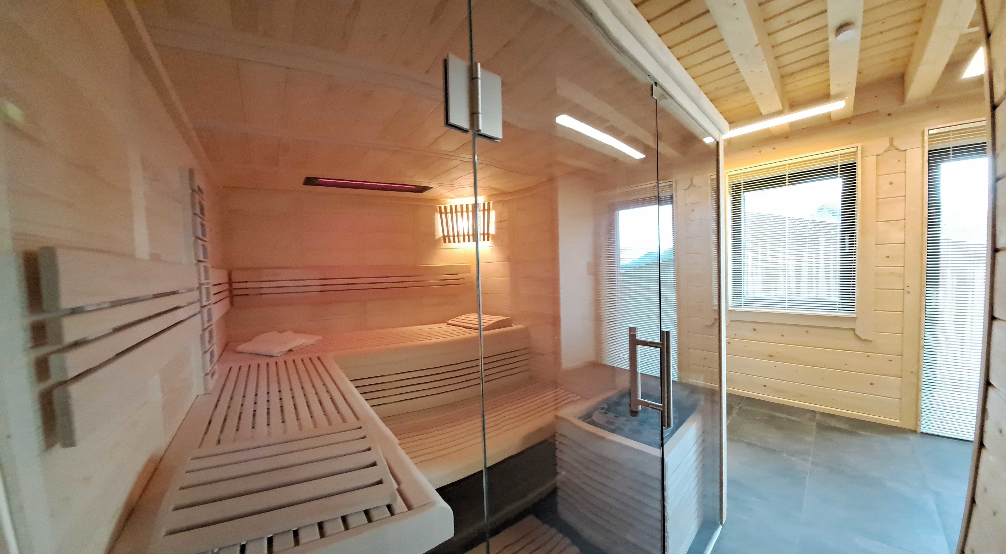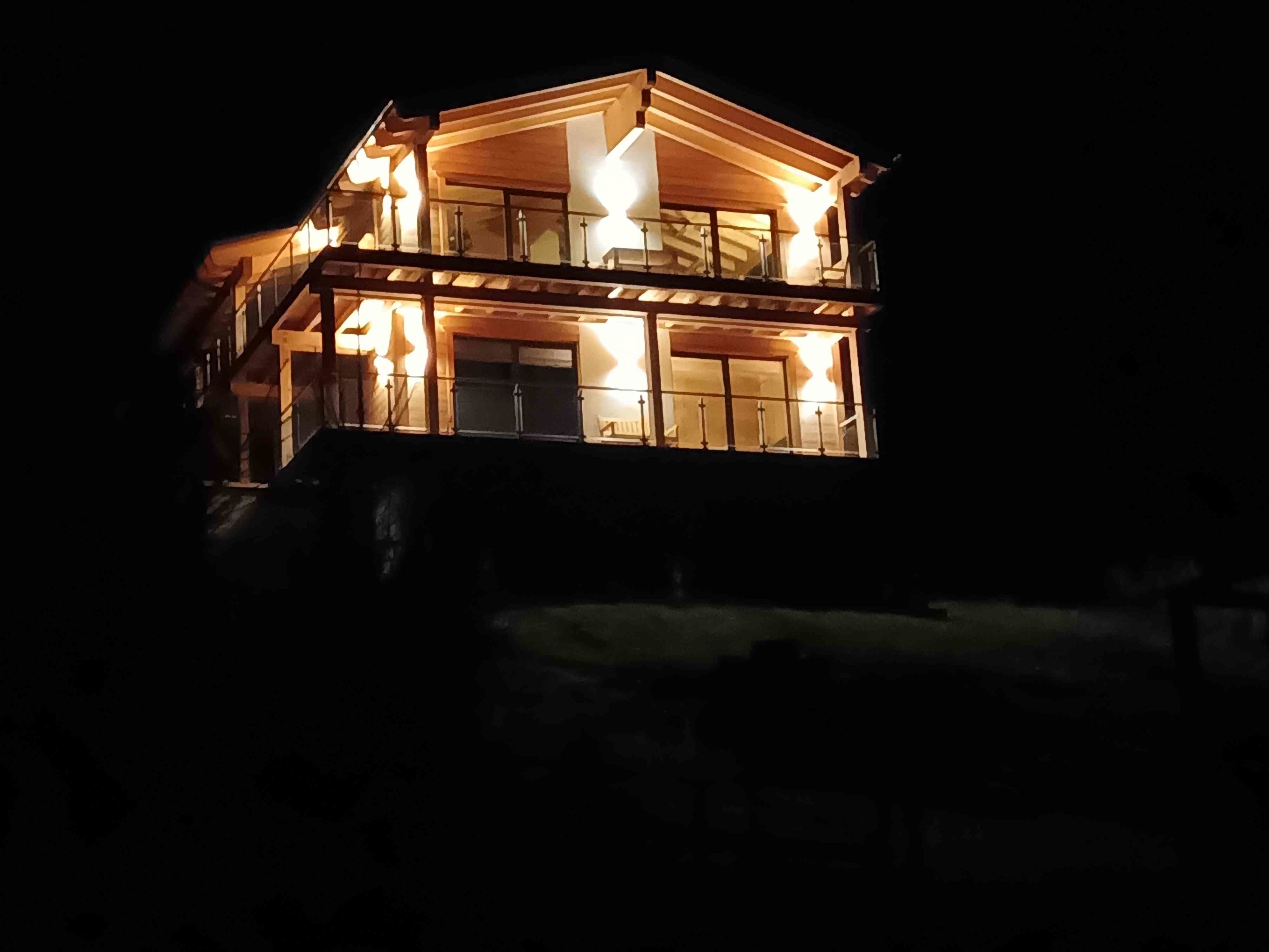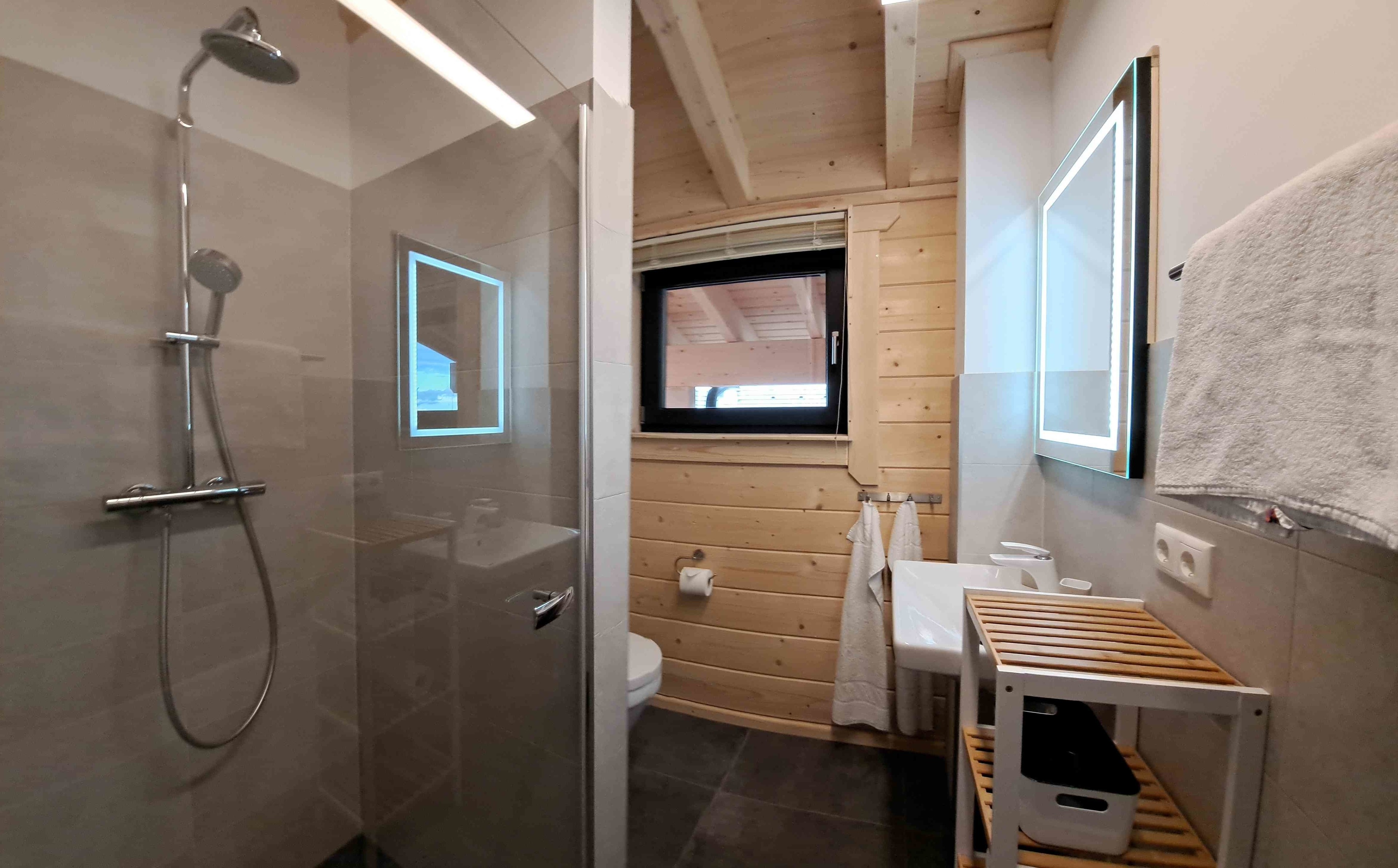 Im OG befinden sich ein Flur mit Garderobe, ein Schlafzimmer mit gegenüberliegendem eigenem Bad sowie ein weiträumiger Wohn/Ess- und Kochbereich mit Pellet-Kaminofen, Smart TV und umlaufendem Balkon mit Auβenmöbeln. Im UG befinden sich eine Kombi Sauna ( Finnisch u. Infrarot) mit XL Dusche sowie 2 Schlafzimmer mit En-Suite-Badezimmern sowie ebenfalls umlaufendem Balkon und Terrasse. Im UG gibt es einen separaten 2. Eingang.