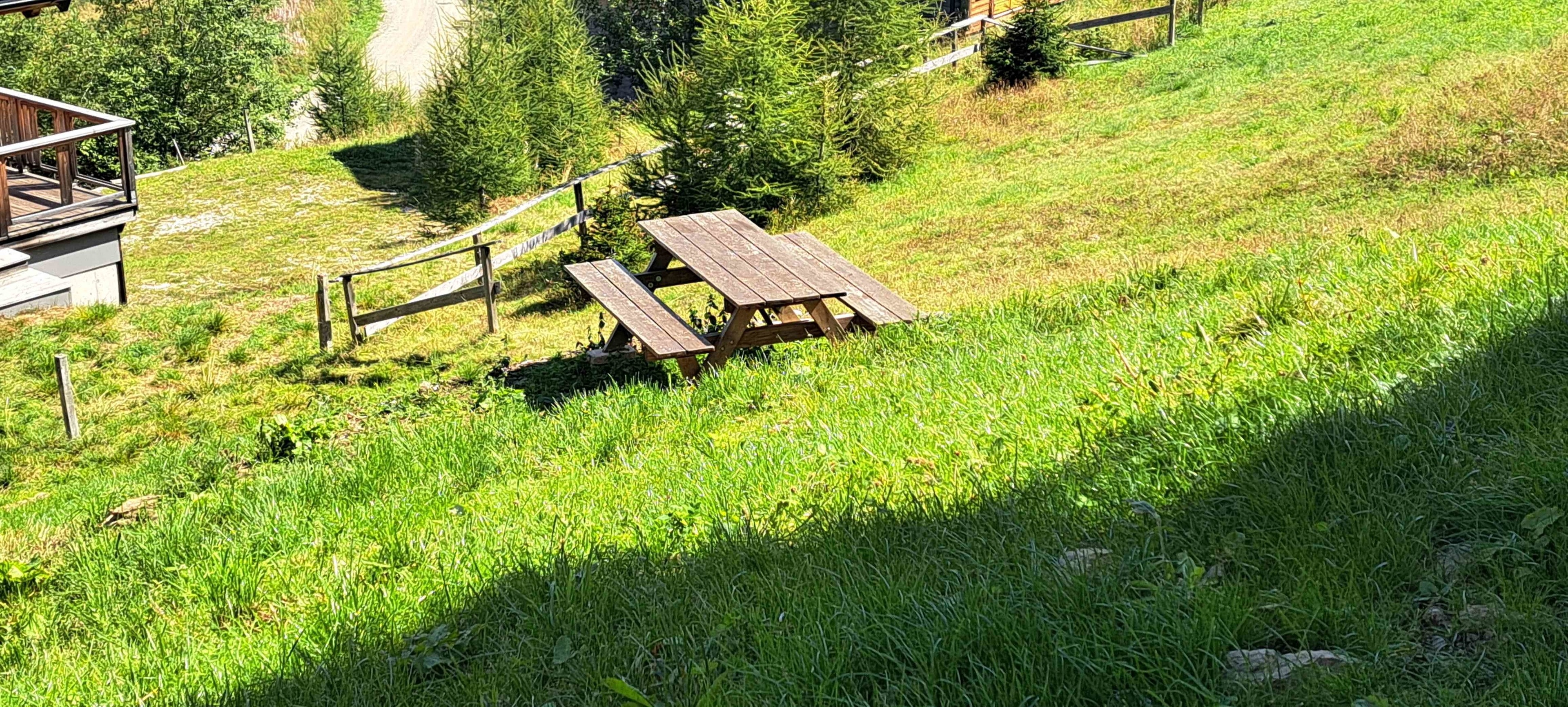 - Die Lodge steht auf einem 650 m2 großen Almgarten, in dem in der Sommersaison eine Picknickbank bereit steht.