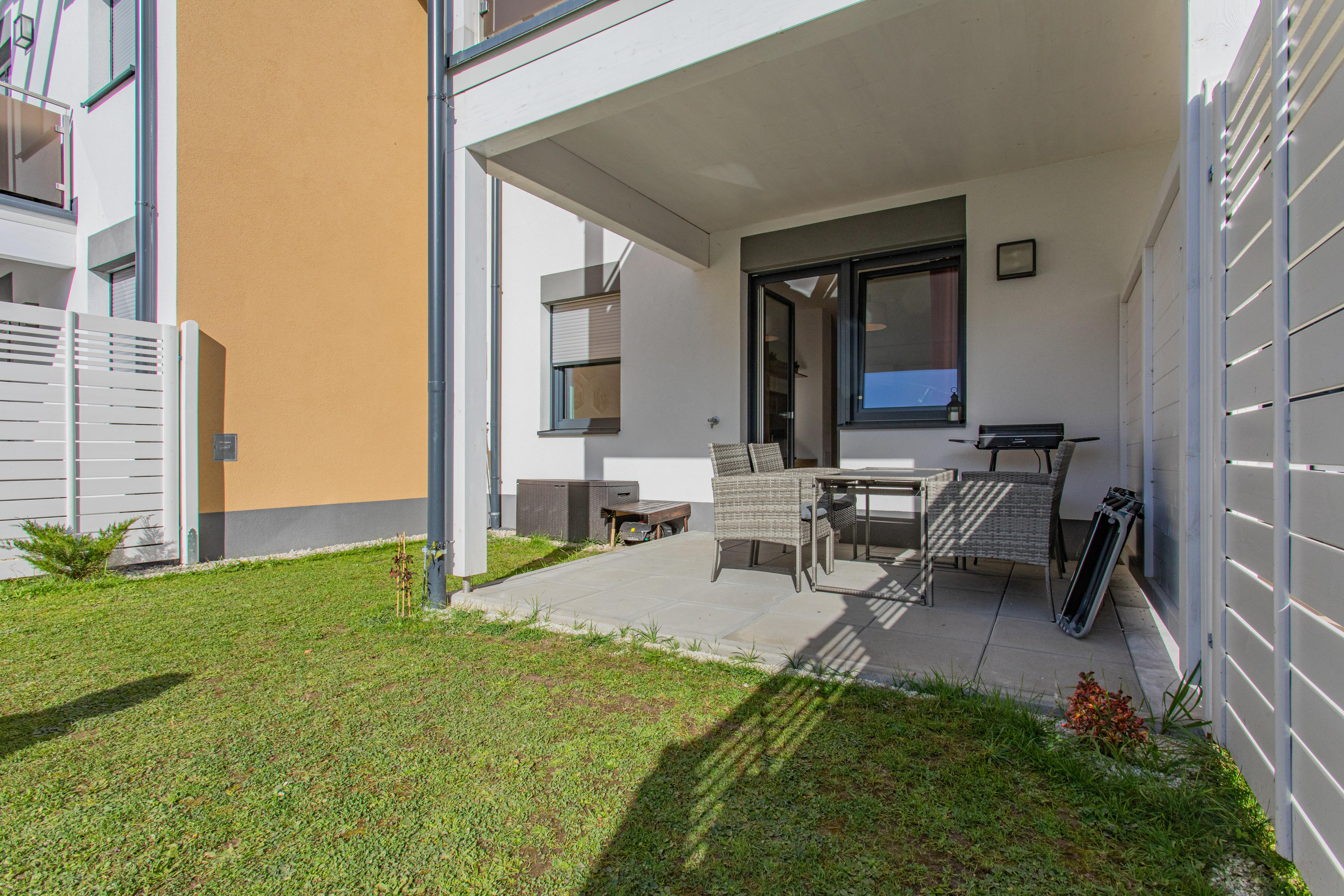 Außerdem verfügt die Wohnung über eine großzügige südseitige Terrasse mit einem kleinen Garten