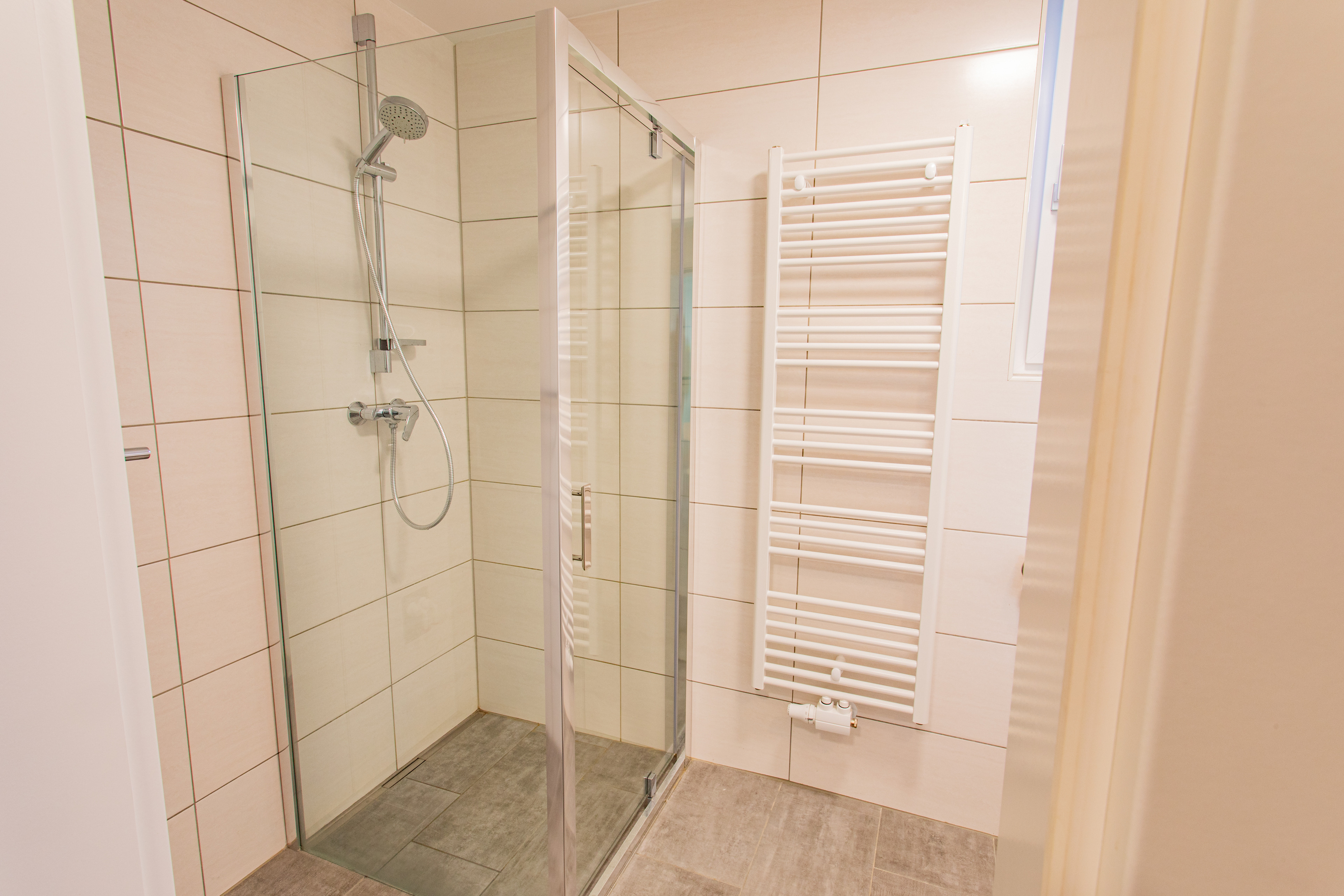 - a bathroom with shower/WC and towel dryer.