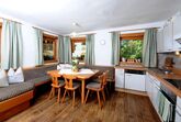 Wohnküche: E-Herd mit Ceranfeld und Backofen, Geschirrspüler, Kühlschrank, Mikrowelle, Kaffeemaschine, Wasserkocher und einem großen Esstisch