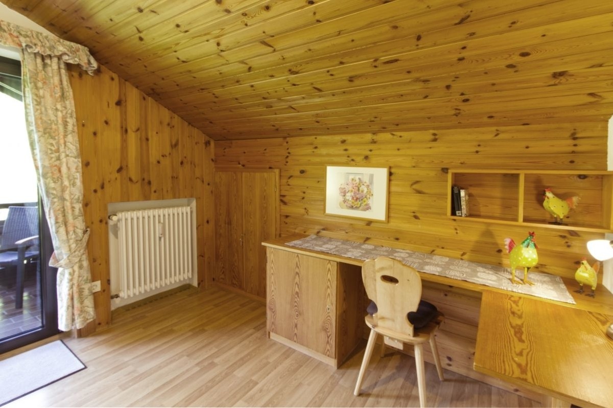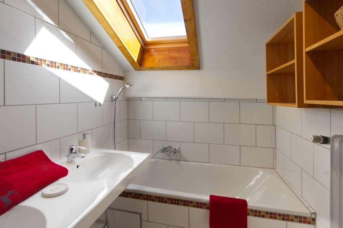 ist ihr geräumiger Stützpunkt für alle Aktivitäten in der Region. Sie besitzt zwei Balkone (Ost- und Westseite) und zwei getrennte Badezimmer. Somit können auch zwei befreundete Familien Privatsphäre genießen und gemeinsam Küche und Wohnzimmer nutzen. Die komplett eingerichtet Küche ist offen gestaltet und mit einer Durchreiche zum Esstisch zweckmässig verbunden. Drei Schlafzimmer (je eines mit Doppelbett, Stockbett und Ausziehcouch) bieten individuelle Nutzungsmöglichkeiten. Alle Zimmer zweigen vom geräumigen Flur als zentralem Raum in alle Richtungen ab. Ein PKW-Stellplatz gehört mit zur Wohnung.