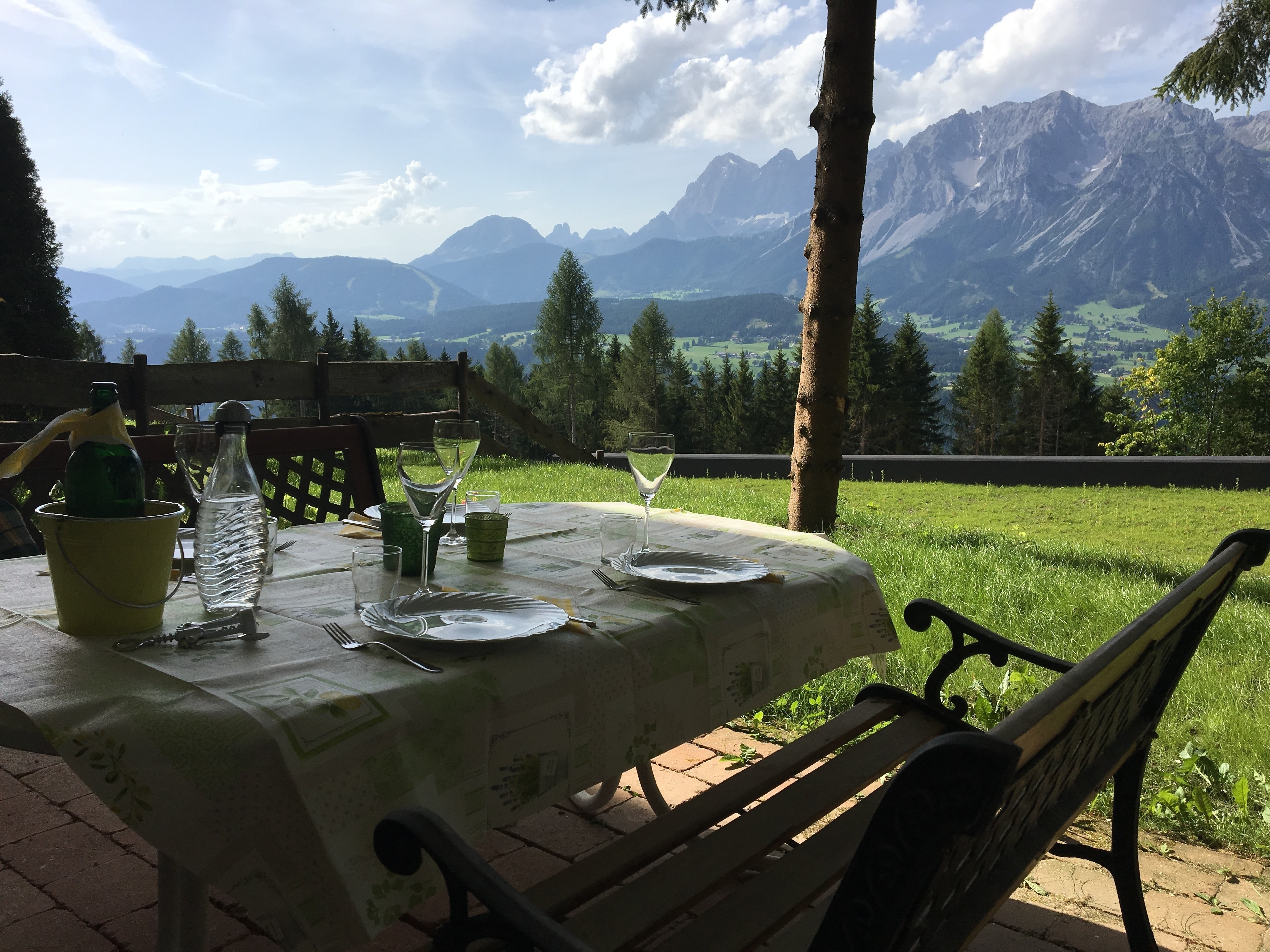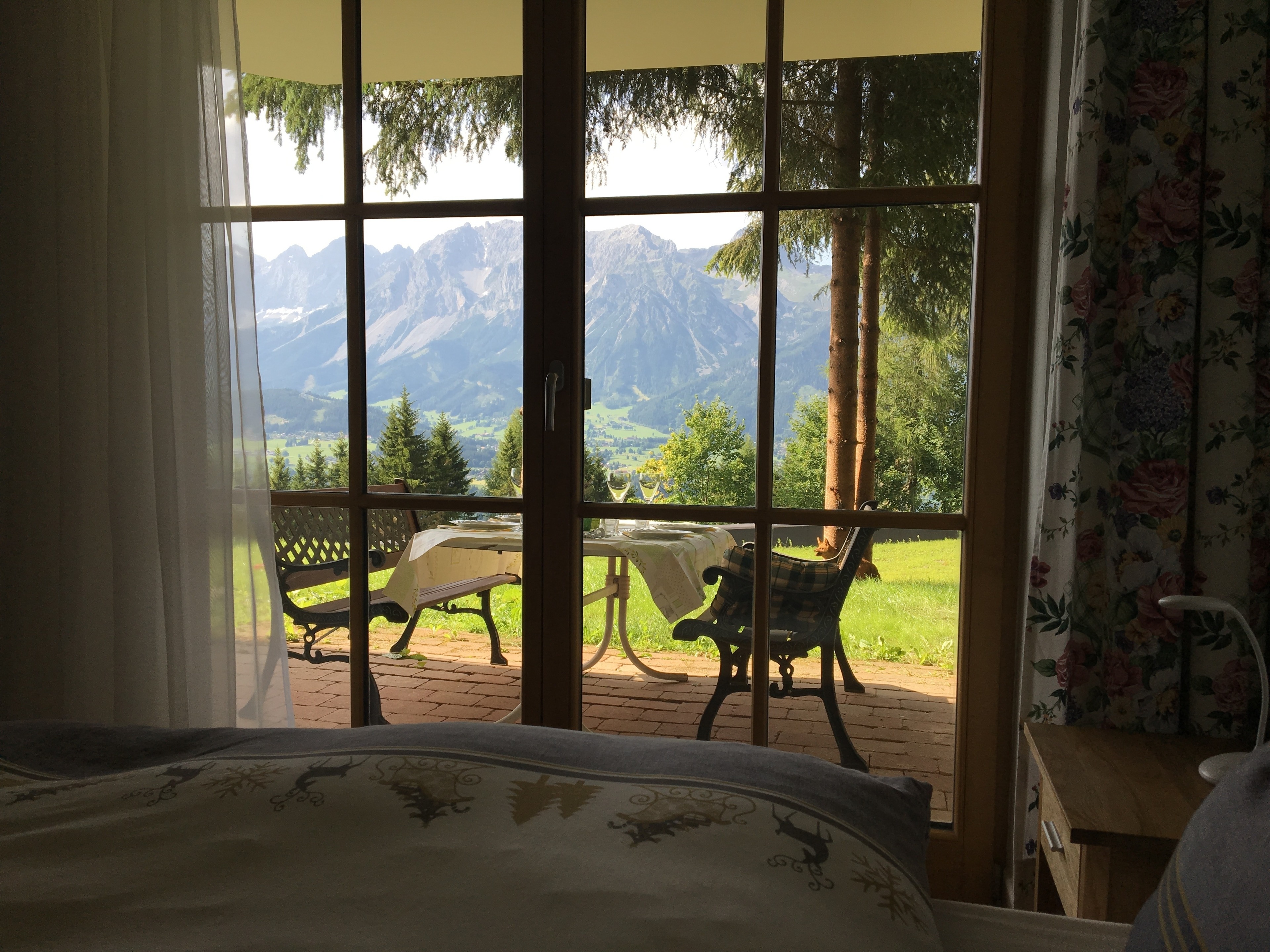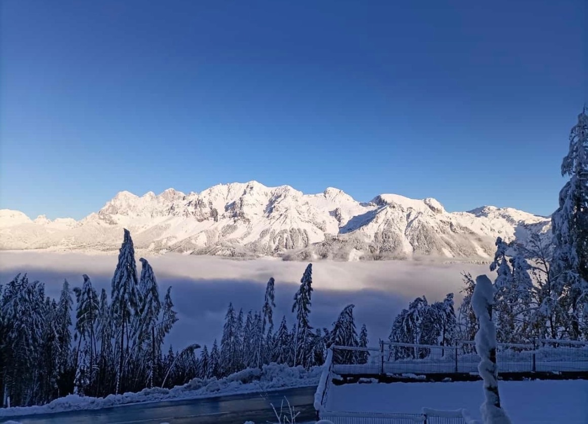 Aus einem Schlafzimmer und aus dem Wohn-, Esszimmer haben Sie einen freien Blick auf den gegenüberliegenden 3000 Meter hohen Dachstein. Genauso von der überdachten Terrasse, wo Sie abends bei einem Glas Wein den Sonnenuntergang geniessen können.