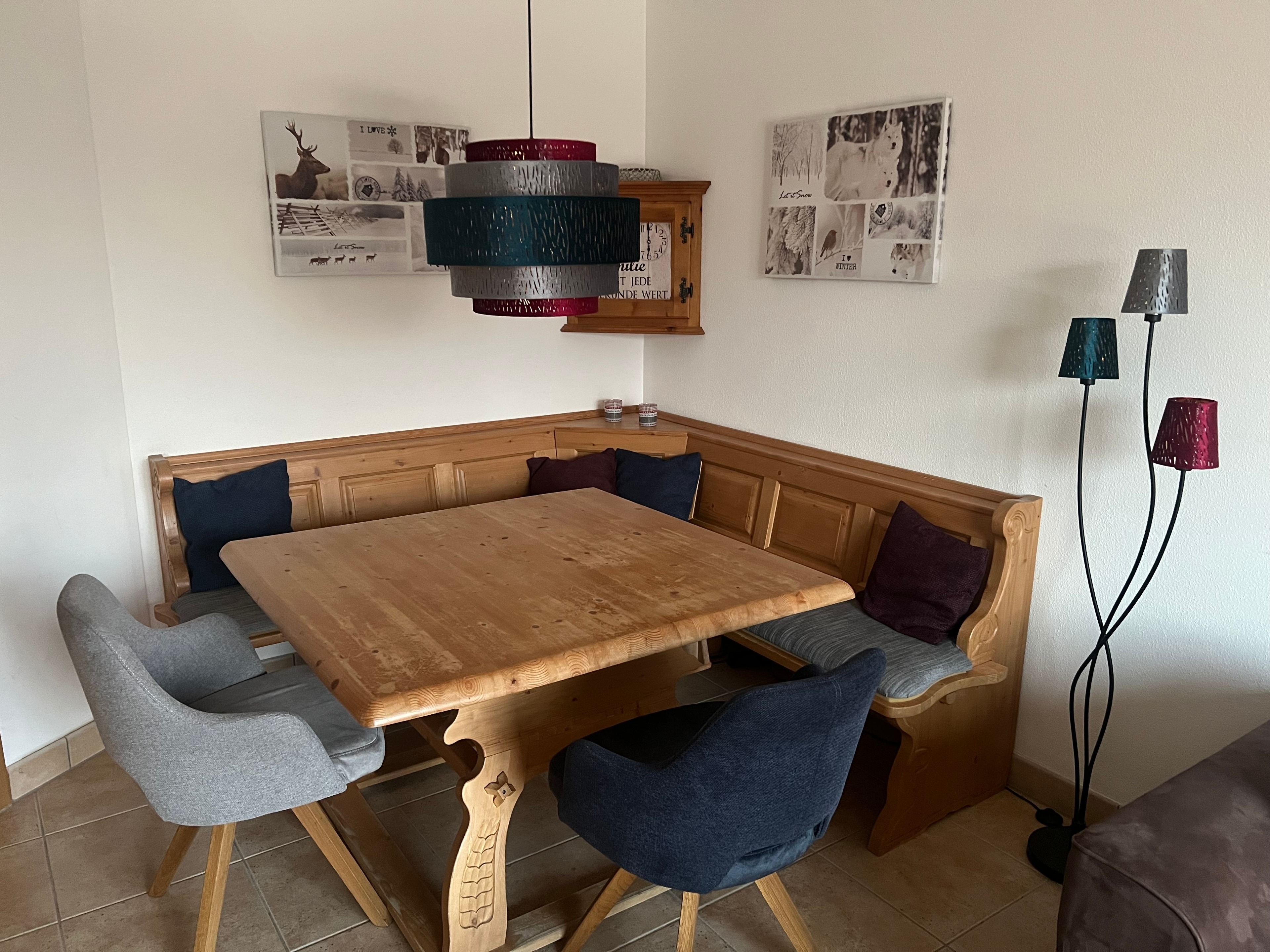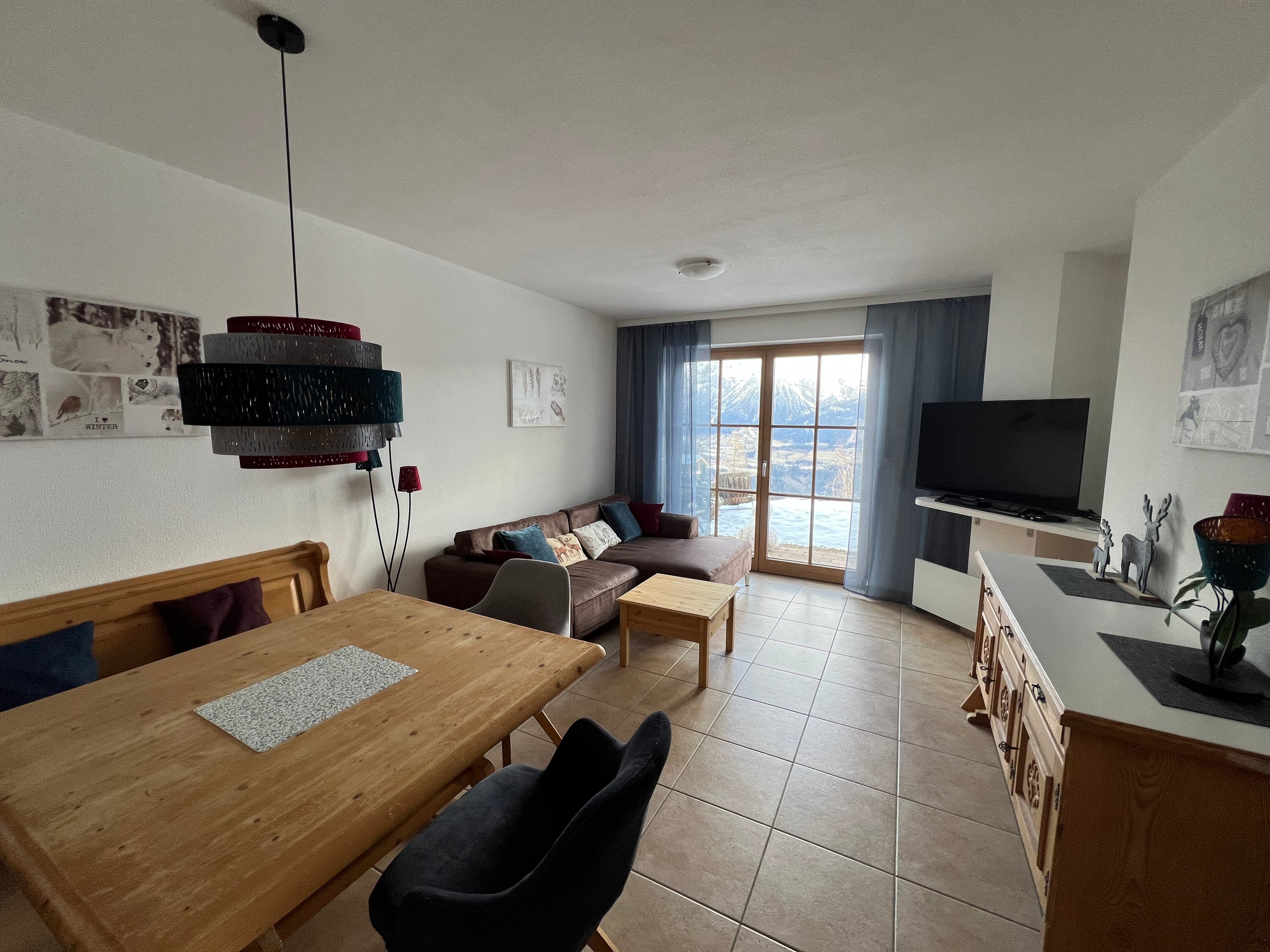 Unsere Ferienwohnung ist ca. 60 m² groß. 6 Betten sind verteilt auf 2 Schlafzimmer. Ein geräumiges Wohn-, Esszimmer bietet viel Platz zum geselligen Beisammen sein nach einem erlebnisreichen Ski- oder Wandertag. Hier befinden sich ein großer Esstisch mit Eckbank und Stühlen und eine Couchecke mit Flachbildschirm.